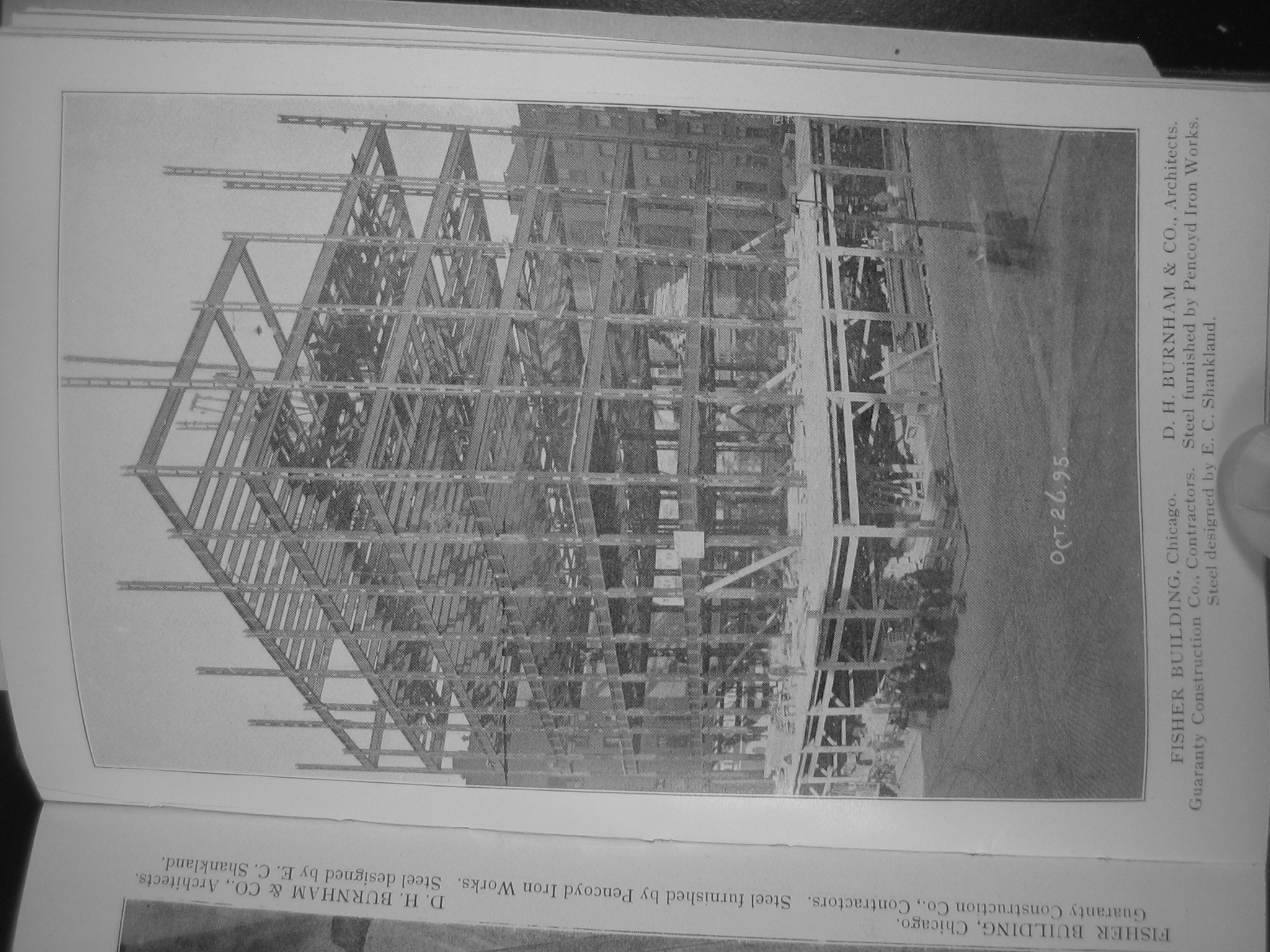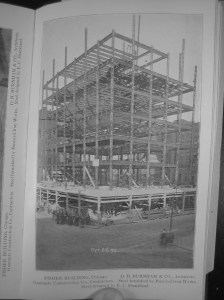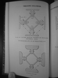 The catalogue (in the Canadian Centre for Architecture’s collection) contained all sorts of tables for safe loads given standard angle sections from Carnegie and other steel works, along with dimensional information for proprietary steel shapes and their resultant configuration as Gray columns. This was just about contemporary with Carnegie’s first steel handbook, and it shows a steel industry on the verge of standardizing its shapes and testing. The catalogue also shows a number of important skyscrapers of the era–the Guaranty in Buffalo and the Fisher and Reliance in Chicago–in construction. Key to the columns’ light weight and strength are the hollows that read as dashed white lines in the center. There’s no steel there, and because of the intermittent nature of the “chassis” pieces you can in fact look right through the column centers.