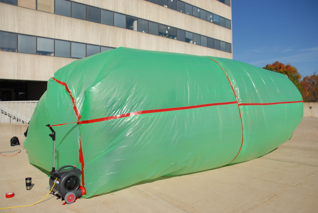 This is the last lab in our graduate students’ structures sequence, so there’s a bit of an elegiac quality to the event for me–but almost certainly not for them. The pedagogy here is admittedly light, and we’re basically in it to do something a bit off the wall and certainly something that will attract attention. There’s usually a mad rush to get things taped up–and then often untaped–as the thing inflates, and the weird, often anthropomorphic nature of the bubble makes for some obvious (and sometimes pretty off color) cracks.