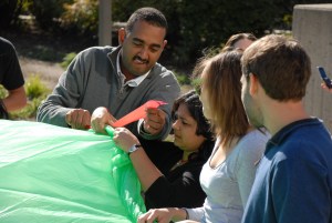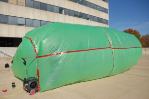 The weather this week was pretty amazing for central Iowa, so we decided that the lab would take place outdoors (despite predictions for 20 mile an hour winds, which fortunately never materialized). (Actually that would have been a pretty spectacular demonstration of some lateral principles). The problem, as always, is to construct a classroom for the 25 students using lightweight plastic painter’s drop cloths, a fan, and some duct tape. The results are always weirdly compelling, and the problems faced in such a seemingly simple problem drive home issues of energy consumption (do we need the big fan once the bubble is up?) and serviceability (hey, did someone kick out the extension cord? It feels pretty small in here all of a sudden…)
