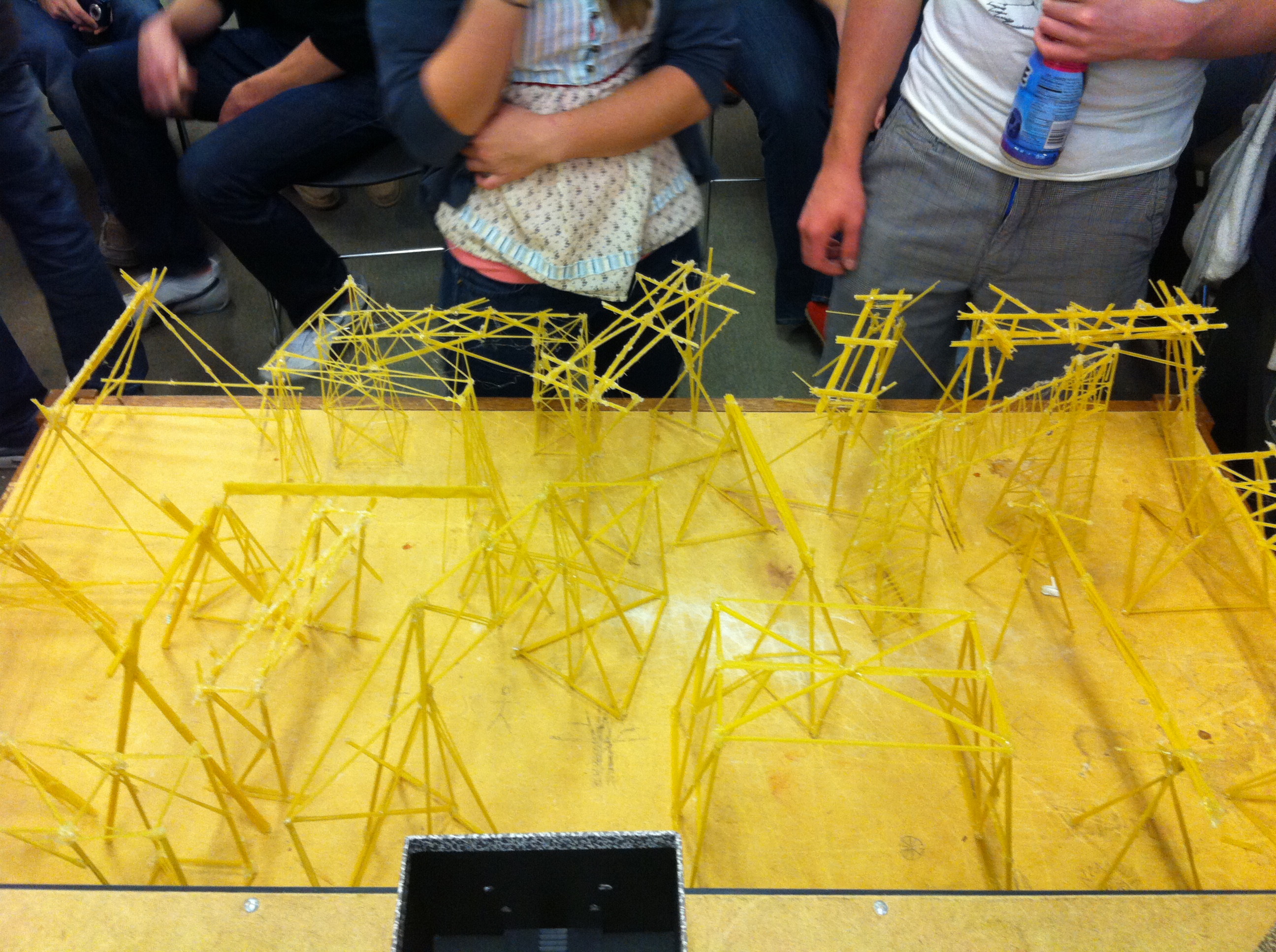 Long time readers and SCI-TECH alums will recognize the pasta engineering to the left as the Spaghetti Bridge project, an introductory exercise we’ve used to start off our structures coursework in Iowa State’s M. Arch. program. The last couple of weeks, Rob Whitehead and I have started a massively scaled-up version of the SCI-TECH structures sequence for our undergraduate program.