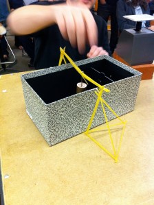 Spaghetti Bridge requires teams of 3-4 students to construct a structure that can span up and over a standard shoebox, and that can support a 200g weight at its midpoint for ten seconds. We usually try to have students do as many iterations as possible–three has been ideal, but with time for weighing, testing, etc., we can only get two in during a 110-minute class. Still, one of the points that gets made is that the iterative design process pays off–the second round involves bridges that are invariably lighter and more efficient than the first.