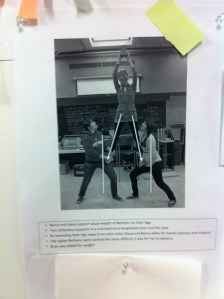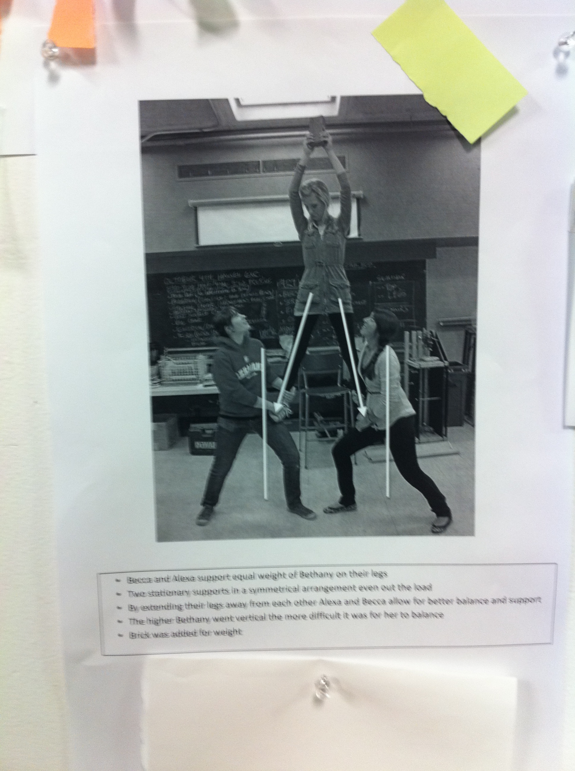 The aspect of the lab that seemed to really work well was that students could feel the internal forces at work in their ‘structures.’ The student to the left, for instance, informed the class that his back and glutes were working quite hard to hold up his legs, but that he also felt it in his arms and shoulders. Not surprising, we pointed out, given that a cantilever beam experiences tension on its top surface. Likewise, the human Eiffel Tower below showed these students that stability works in multiple directions; the student on top said that she felt very confident that she wasn’t going to fall left to right, but she was quite nervous about falling to the front or to the back.