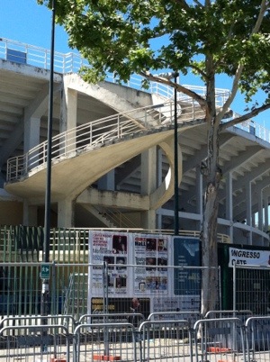 Nervi clearly won out, and the result was one of his more complex weavings of structure and circulation. The roof was a restatement of his folded ferrocemento ribs at the Torino Esposizione, here wrapped into a circular plan and propped up by attenuated in situ concrete fans. These, in turn, were supported at the edge of the seating bowl by inclined piers that echoed those at the Savona rail station, with a section that twisted to minimize interference with circulating spectators below. The concourse itself was covered by a ring of propped, double cantilevered concrete bents, and enclosed by a steel-braced curtain wall system that echoed the contemporary exterior of the Palazzo Lavoro, and the underside of the seating bowl was formed from lamella ferrocemento pans that were similar to those being used for the Palazetto several miles north.