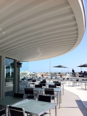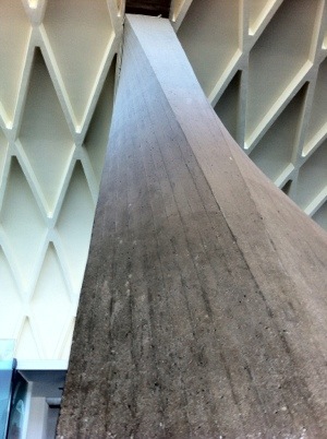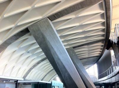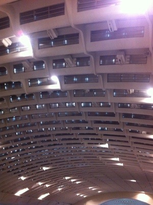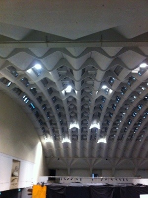 And that’s a double-edged sword. Like most greatest hits collections, the Palazzo is a convenient place to see many of Nervi’s main themes in action, but whether they hold together in a consistent narrative or not is another story. The building section is complex enough that it isn’t really easy to grasp unless you spent some time moving through it (for the record, the security guard who let me in wasn’t terribly interested in such meditations…). And unlike the smaller Palazetto, it’s hard to understand the building as a whole. The Palazetto is a single idea relentlessly expressed: a lamellar dome, lifted above seats and circulation by a ring of structural forks, and inflected to bring in daylight. The Palazzo can’t quite be summed up like that. It’s a necessarily more complex building, but there isn’t the single diagrammatic stroke that makes it cohere. It’s also true that daylight plays a far smaller role here (in fairness, the upper level windows have been blocked off for daytime events, so you can’t really tell what it would have been like flooded with sun).