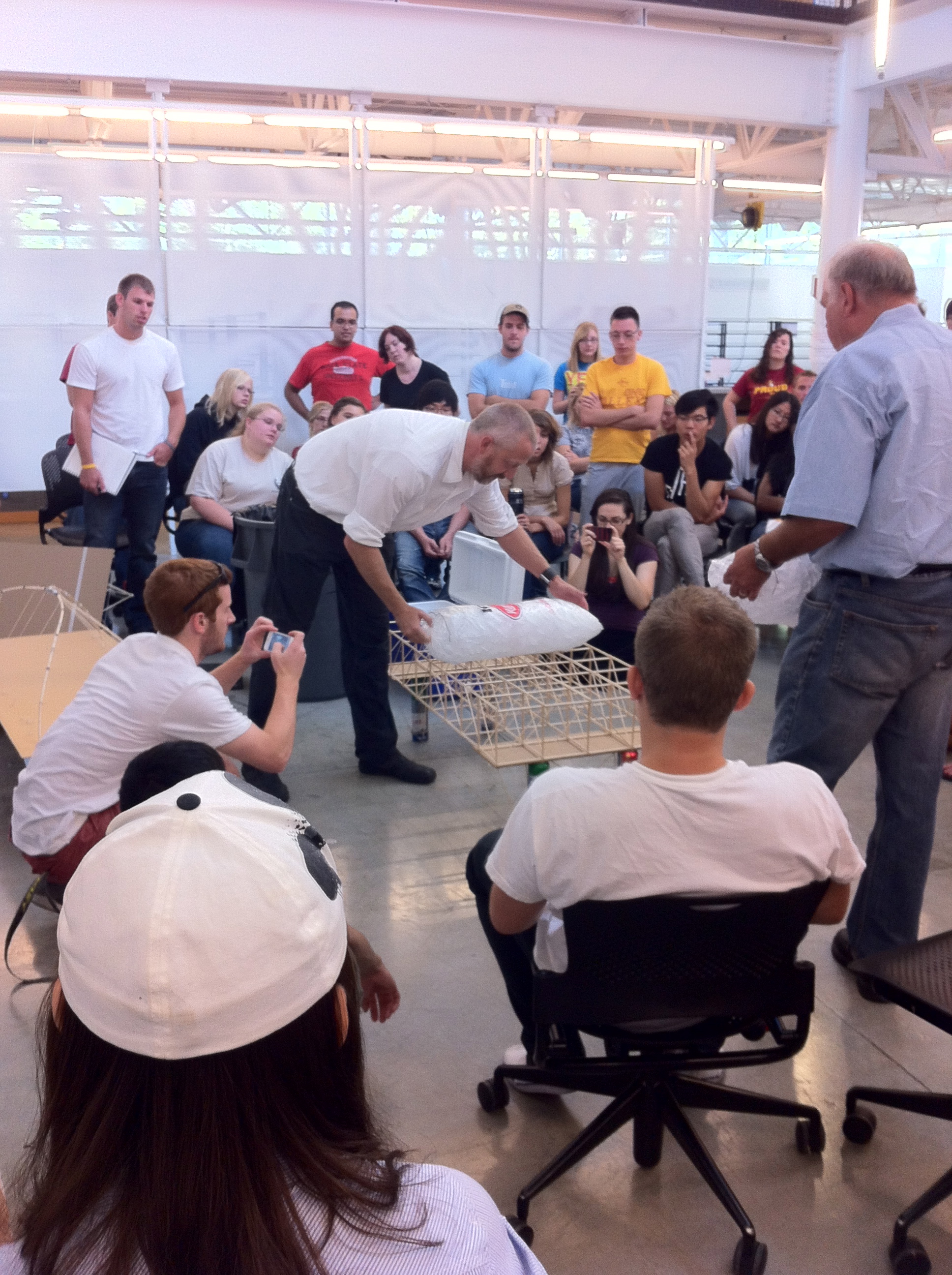 Hugely enjoyable Friday morning last week standing in the background and watching my colleagues Rob Whitehead and “rookie” Chuck Saul put a bunch of student-built longspan models through their paces. Those are 20-pound bags of ice, and yes, a bunch of models managed to carry somewhere between 60 and 70 pounds. Not bad for fourth year students.