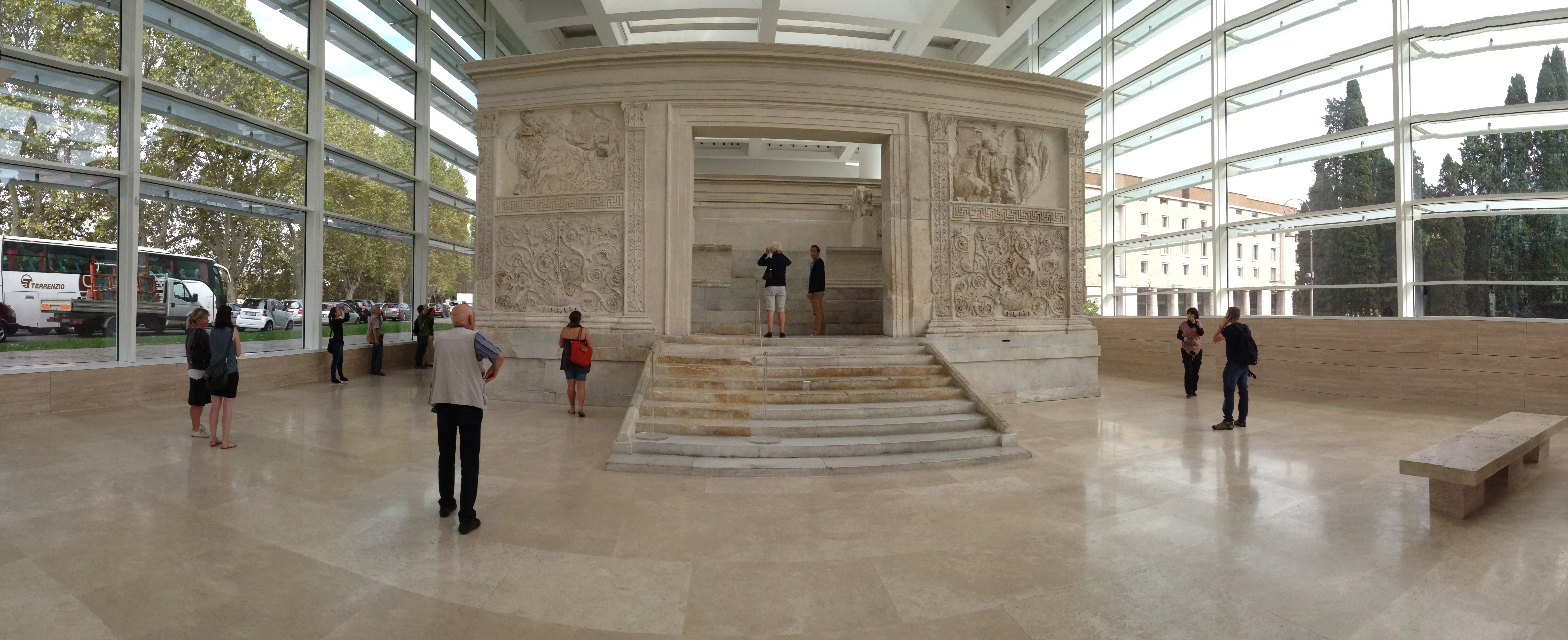 So the restoration and re-sheltering of the Ara Pacis was, to say the least, loaded. And the selection of a modernist American architect was as big a statement, in its own way, as the construction of the piazza, or even as the construction of the original. This is one of the more blatantly fascist squares in Rome, and by commissioning a building whose aesthetics are less about traditional monumentality and more about transparency and access the clear message was a renunciation of the posturing and aggression that the fascist style represented. And as critical as I can be of Meier’s work, this one is both subtle and surprisingly site-specific. The elevation facing the Mausoleum is a stark box of white and glass–you can see the Ara Pacis inside–atop the Mussolini-era reconstruction of the res gestae, the posthumous “lives and deeds” of Augustus. No clearer architectural statement possible–that reads as an artifact, and the glass pavilion on top couldn’t be more different in materials and tone from the monumental, imposing blocks on the other three sides of the Masuoleum. Because of the drop across the site, though–the Lungotevere here is raised well above what had been the flood plain of the Campo Marzio–the museum reads as a one story glass pavilion that hovers above the riverfront boulevard, with travertine walls on either side making a material nod to tradition. It’s maybe not my cup of tea, but it’s not bad, and it is pretty clever about where it sits in this long historic conversation about form, space, and power.