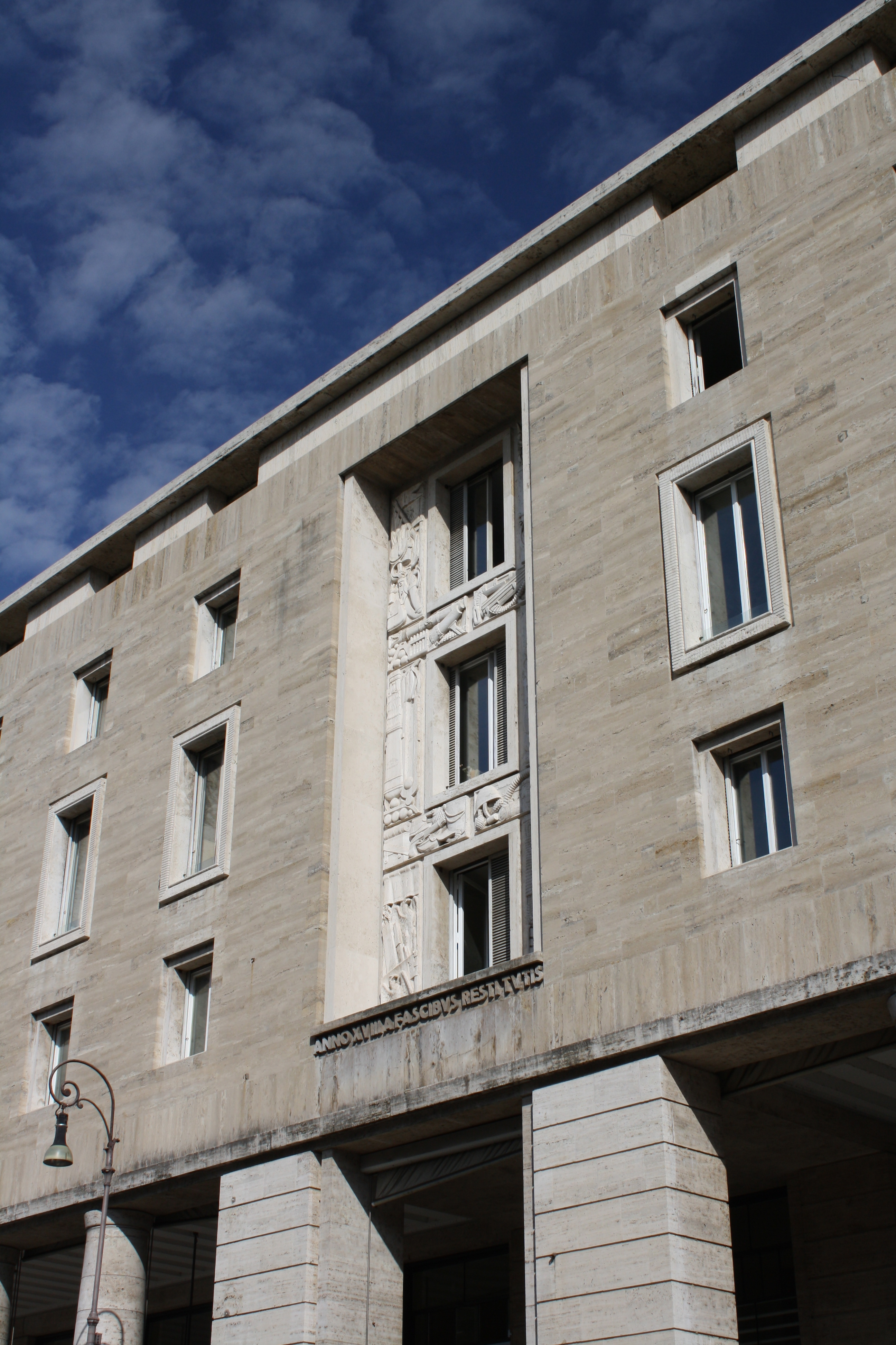 You can just make out the text at the bottom of the window–which says, essentially, “Built in Year 19 of the Fascist Era.” As Prof. Bowes pointed out, both Augustus and Mussolini wanted to show not only that they controlled space, they also wanted to show that they controlled time.
