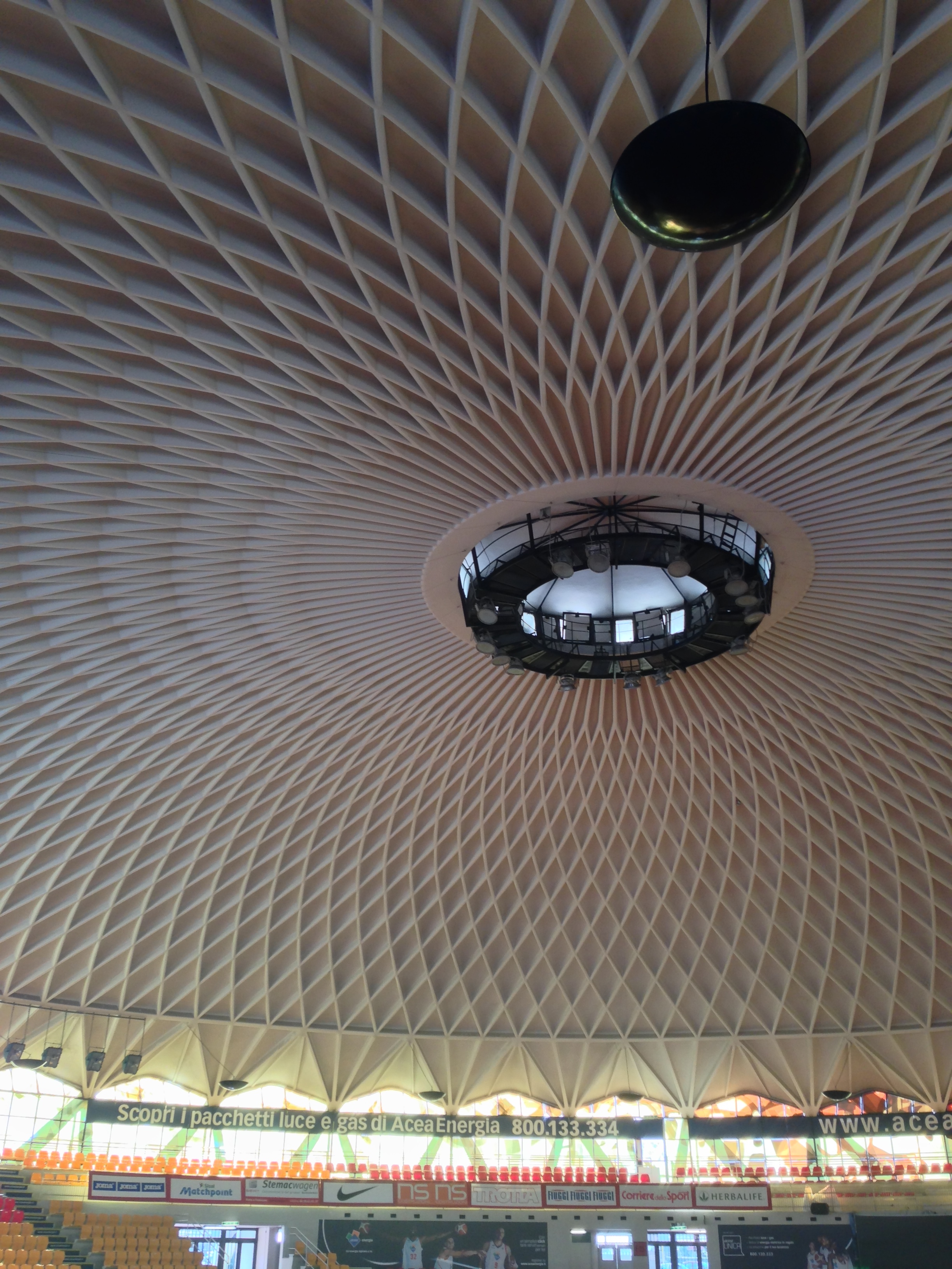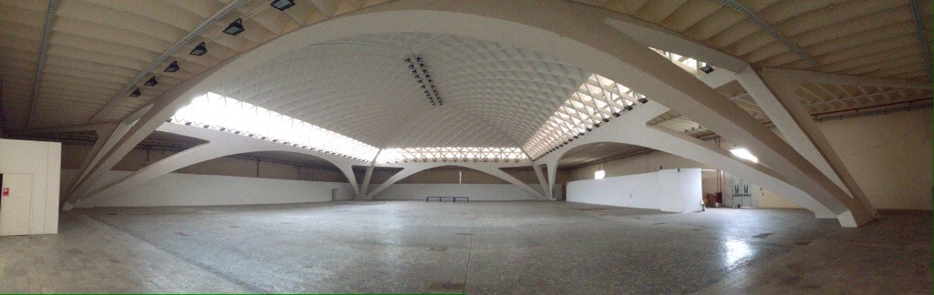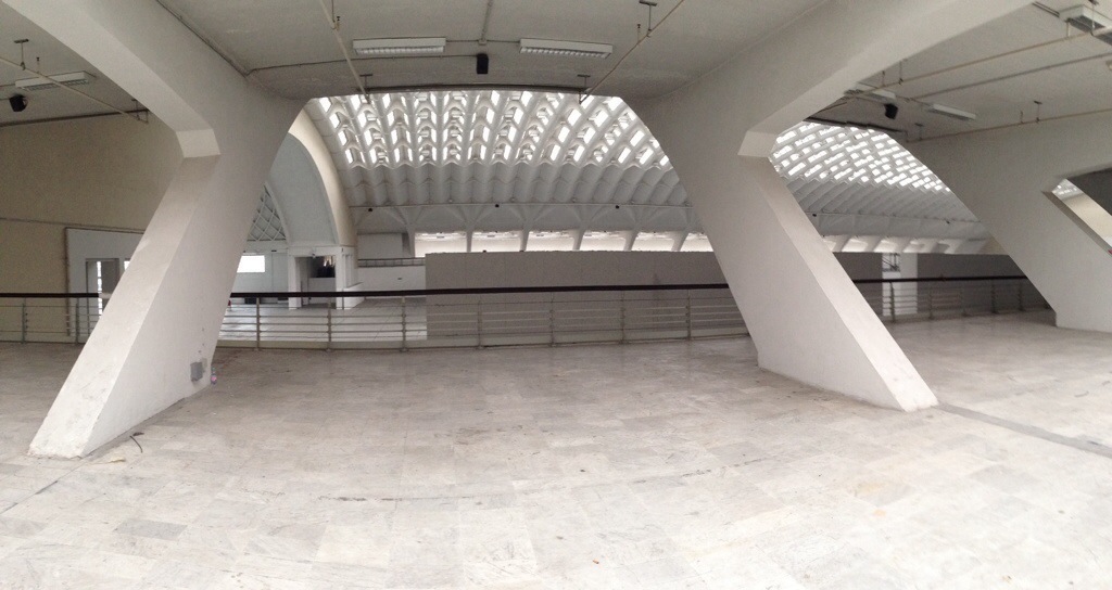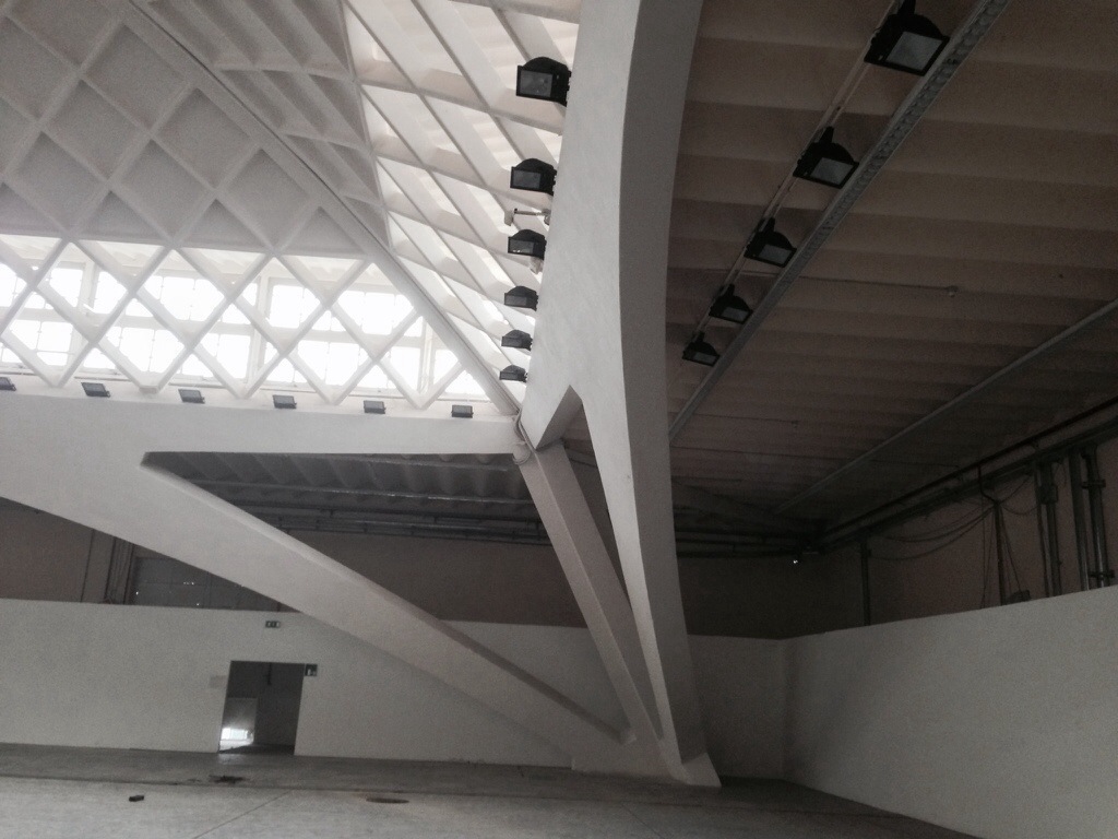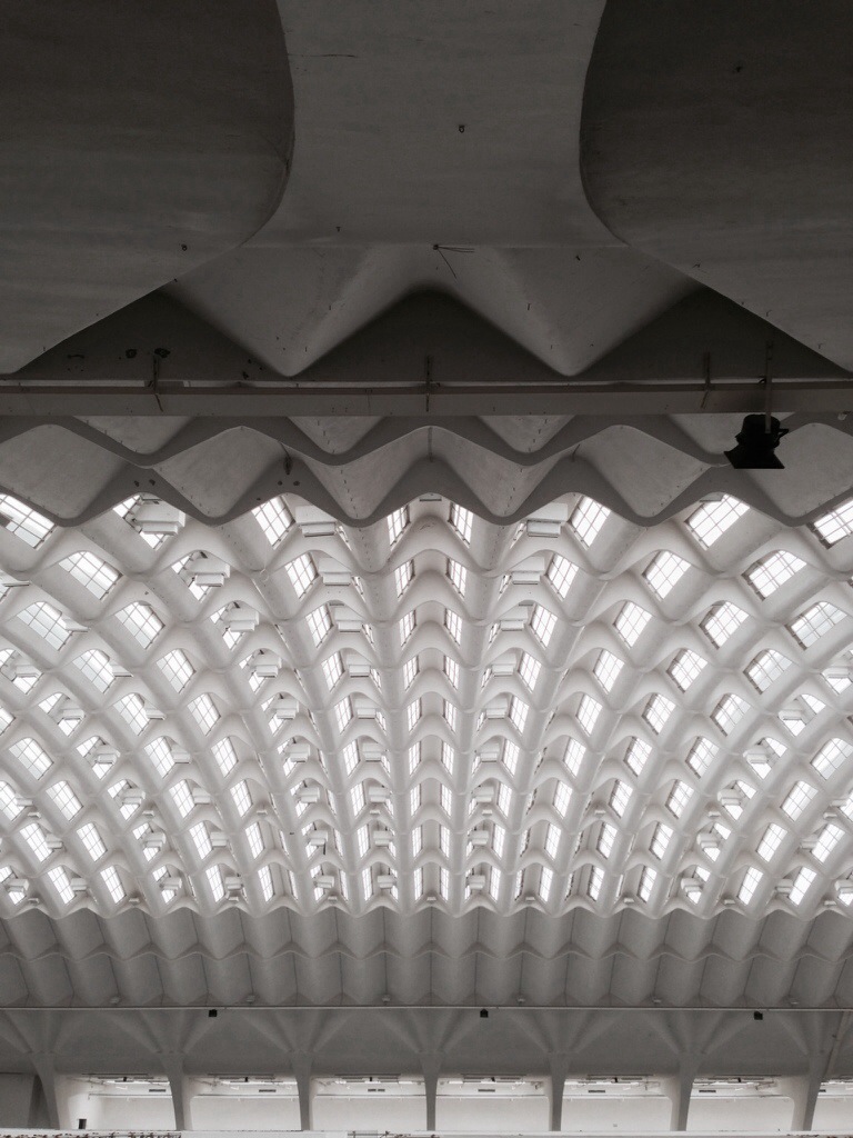 Nervi’s first two skyscraper projects are literally right across the street from one another in Milan–the Pirelli Tower, finished in 1956, is well-known, but the Galbani Building (to the left there), finished simultaneously, is more interesting than it looks. Nervi was a consultant to Soncini, Soncini, and Pestalozza on this one, and while the outer form is less dramatic (and much shorter) than Pirelli, the construction system is a clever variation on the folded-plate ferrocemento system that he’d used with increasing sophistication in the Turin Halls.