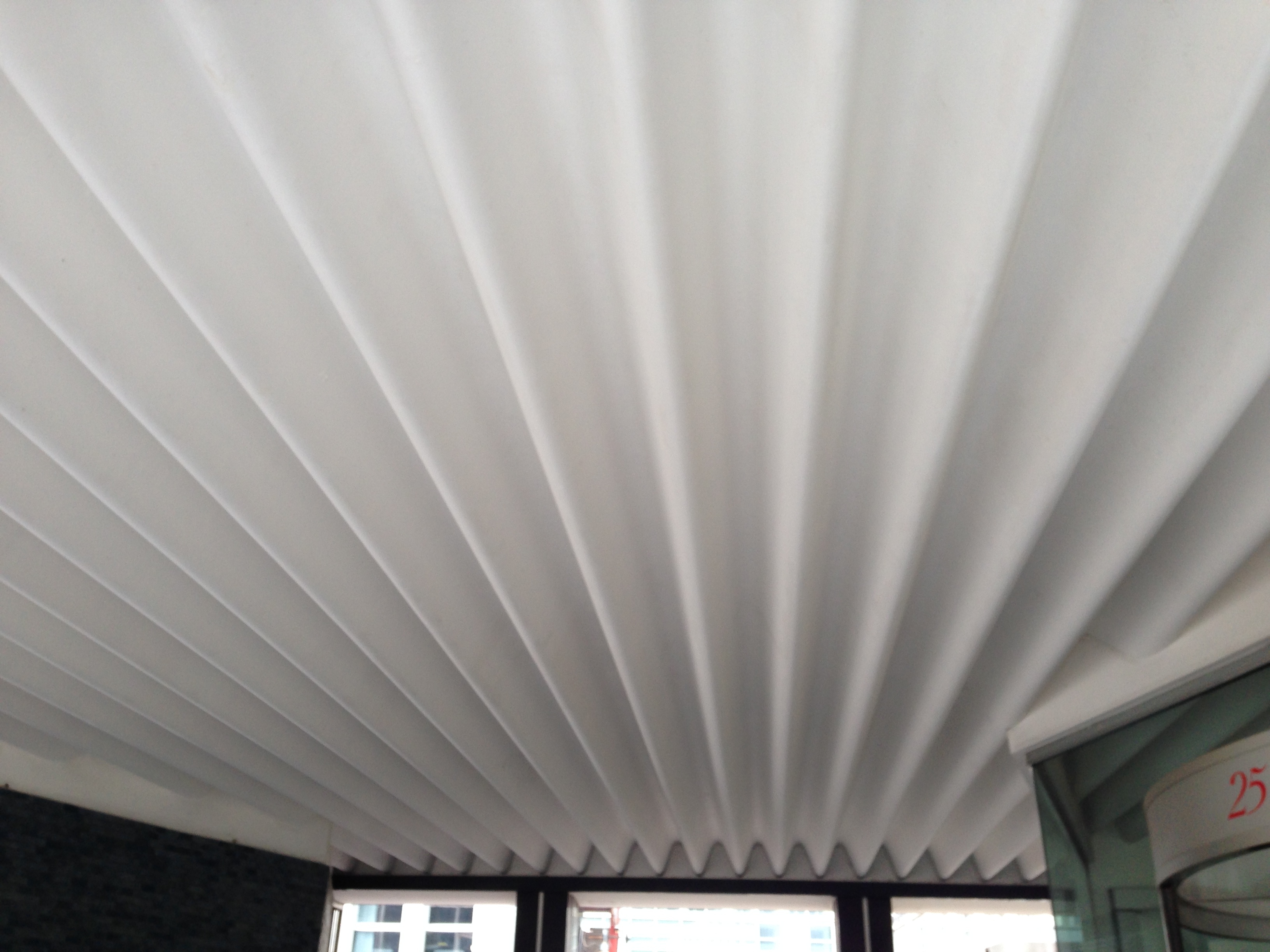 Fortunately, the system forms the lobby ceiling, so even on a Sunday afternoon (and even more importantly, without a good inside contact to open doors…) you can see a bit of it. It’s a pretty tight grain, and from a section published in Buildings, Projects, Structures it doesn’t look like there was any room for integrating lighting or mechanical systems. There was, however, a good code loophole that let them measure floor-to-ceiling height to the mean depth of the ceiling, which allowed the Soncinis to squeeze an extra floor in under their height restriction.