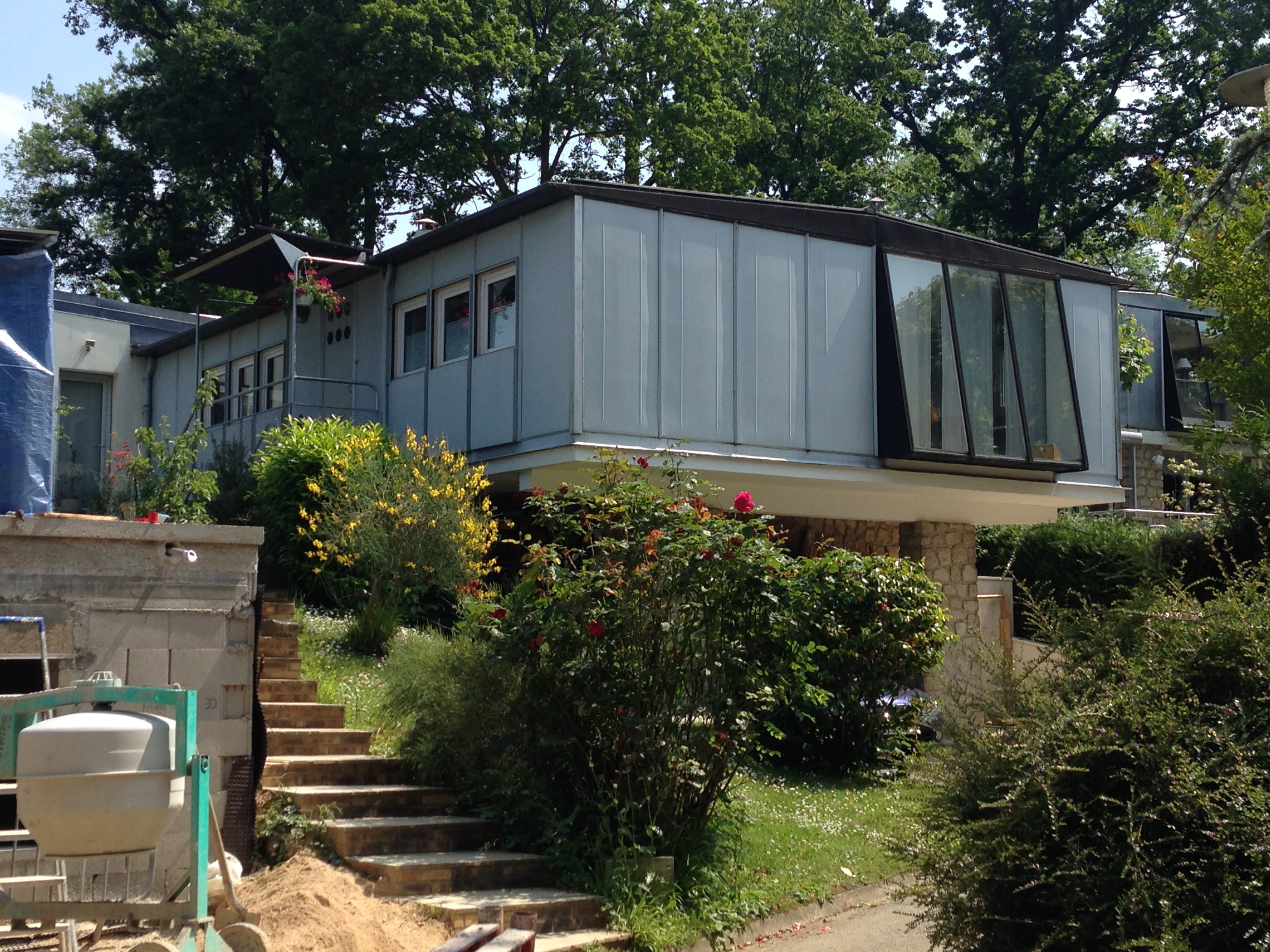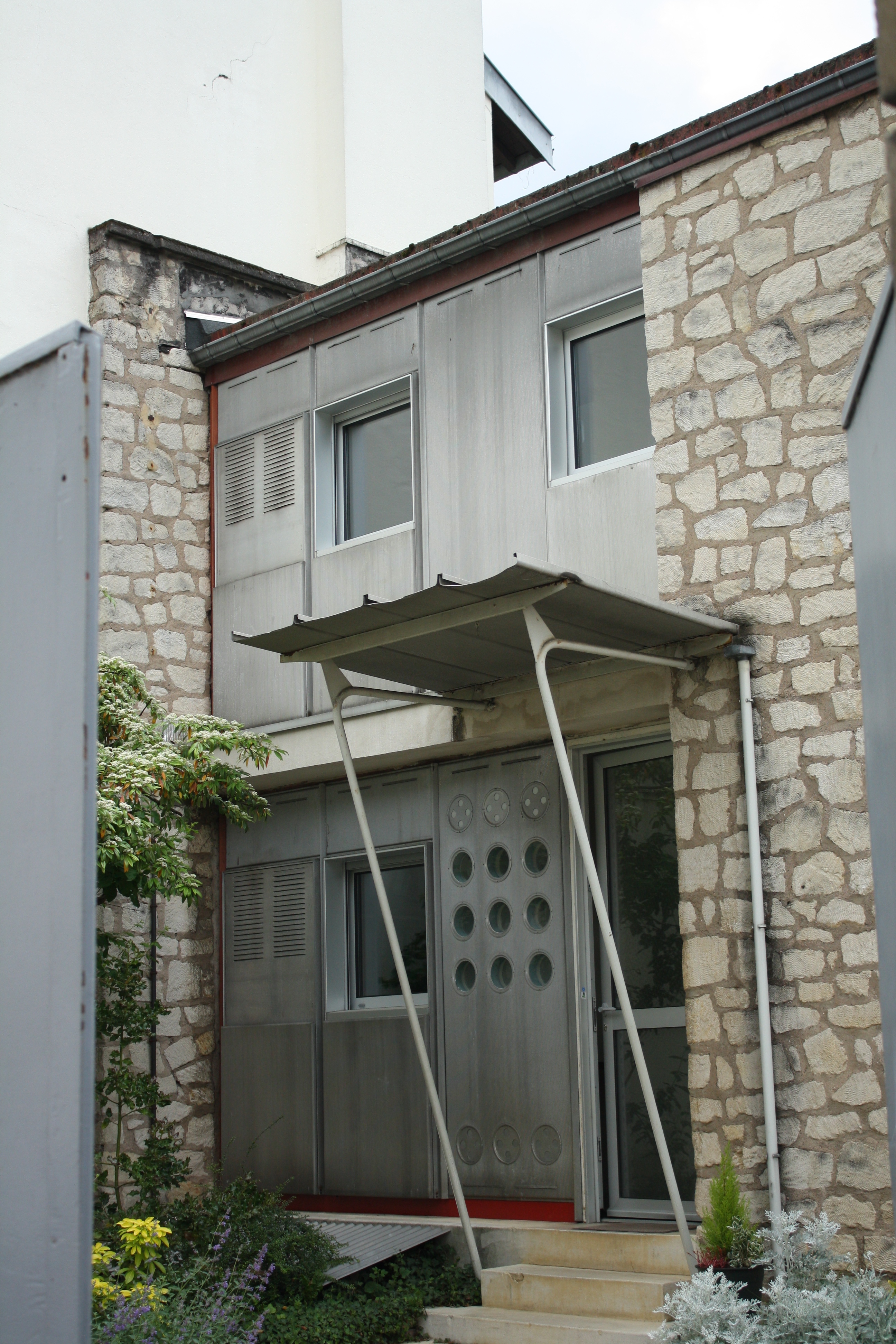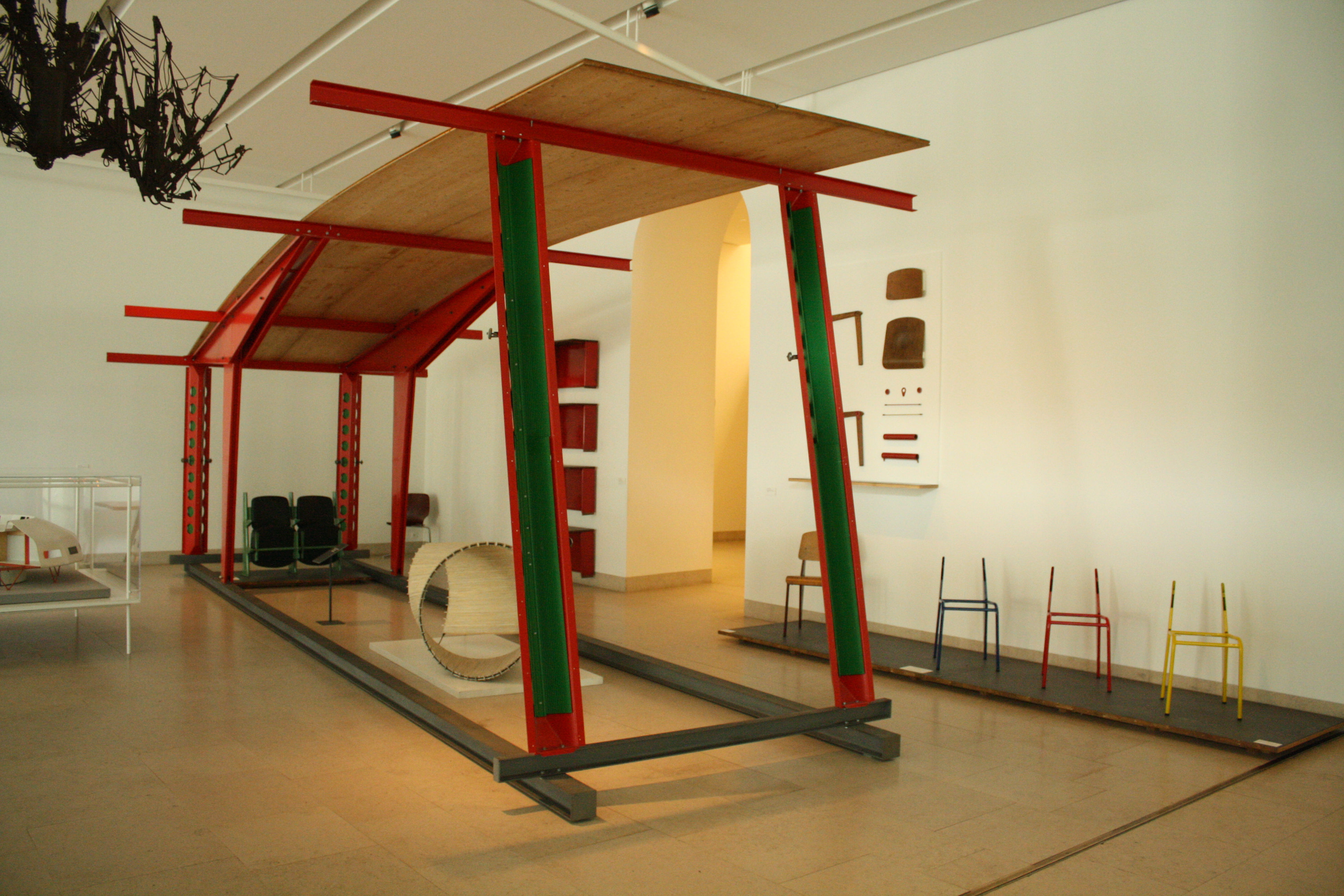Like those, there. Nancy has done a good job of presenting the work of the Prouvés, including a walking tour (OK, actually more of a driving tour, as the helpful tourist officer pointed out, but if you have a good set of shoes and a whole day you’ll be fine) and two separate museum exhibits–one at the Musée des Beaux-Arts on the Place Stanislas and one a couple of miles south in Jarville at the Musée de l’Histoire du Fer, a museum that tells the story of the region’s iron-working industry. Right there, that’s interesting. Not many figures could have their work shown in an art museum and an industrial history museum. This is the architectural history/construction history dilemma institutionalized–is architecture more art or more industry? Prouvé makes this even more difficult, since he was an artisan more than he was either an architect or an engineer. Nervi got around the question by calling himself a ‘builder,’ but Prouvé’s designs sprung even more directly from individual components–from the bottom up, as opposed to the Beaux-Arts ideal of design from the top down. This is an entirely inductive, not deductive, approach. Gradually, Prouvé moved beyond the ornamental ironwork that the family was famous for, and began working with steel as a mechanical material, finding ornament within the rolling, cutting, and bending processes of the fabrication shop and combining them with a very subtle lyricism; his building and furniture designs from the 1930s onward are all rigorously pragmatic but also stylish, a rare combination that was equaled only by Charles and Ray Eames.
