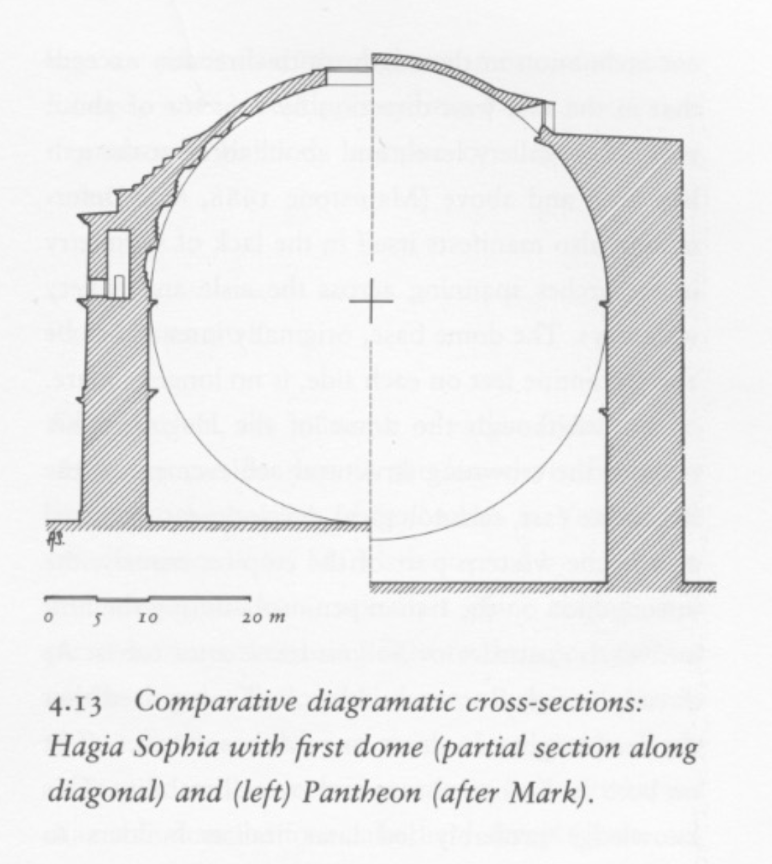 So, last week’s sketch question? Take the Basilica of Maxentius, or the Pantheon, or the Aya Sophia, and come up with an efficient way to scaffold the roof. Timber’s scarce in all three eras/locations, so find a way to do it that minimizes the amount of wood you’d need. We’d talked about the fact that neither the Pantheon nor the Aya Sophia could take hoop stresses–the cracks at the former’s base and the windows around the perimeter of the latter show that–and I suggested that might be a clue as to how you could scaffold an ancient dome. Several students realized that this meant the scaffold wouldn’t have to form the whole dome at once–if the dome was going to behave like a series of radial arches, it could be built like a series of radial arches. So this scheme for the Pantheon and the Aya Sophia both suggested wedge- or strip-shaped scaffolding that could be used for form a segment of the dome, dropped slightly, and rotated to the next position.