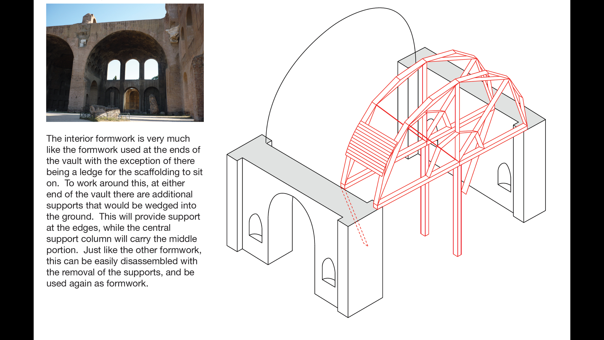 More difficult? How to build groin vaults like the Basilica of Maxentius. Here, you’d have to build each vault completely, and the best you could probably have done was to build a bay at a time of timber, form the vaults, knock them down, and move them to the next bay. We agreed that the kickers here would probably have been supplemented by a pretty hefty network of ropes and cranes–otherwise it would have been a pretty big splat when the centering came down.