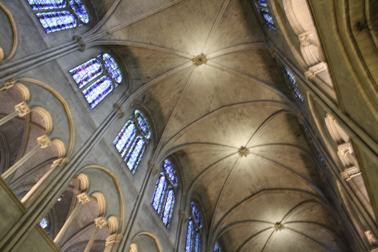 That incident may provide some modest hope. Reims’ stone vaulting survived the shelling, though it was heavily damaged. The lost roof over Notre Dame, like those of the other great cathedrals, was primarily a weather covering, to keep rain and snow off of the vulnerable limestone vaults and mortar that form the main spaces of the cathedral below. It wasn’t structural, in that the vaults, piers, and flying buttresses that structure and surround those spaces below have functioned as support on their own–and, in fact, one of the major structural problems with gothic vaults was absorbing the thrust from the pitched timber roofs above them.