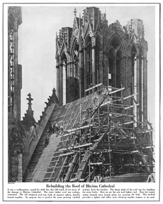 What’s been burning the last couple of hours is the timber roof that had rested on top of the cathedral’s stone vaults. Initial reports are that there was renovation being done in the structure’s attic, which makes sense given the presence of scaffolding in much of the footage, and it’s possible/likely that this activity led to the blaze. At least some of the roof, including the spire that collapsed, was actually part of the 19th century ‘restoration’ by Viollet-le-Duc. Its loss is catastrophic, but it would not be the first cathedral roof to be destroyed by fire–Rheims’ timber roof was destroyed in a conflagration caused by shelling during WWI.