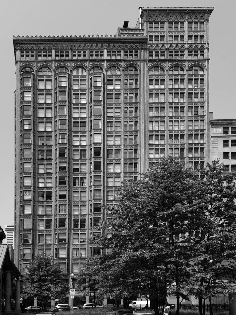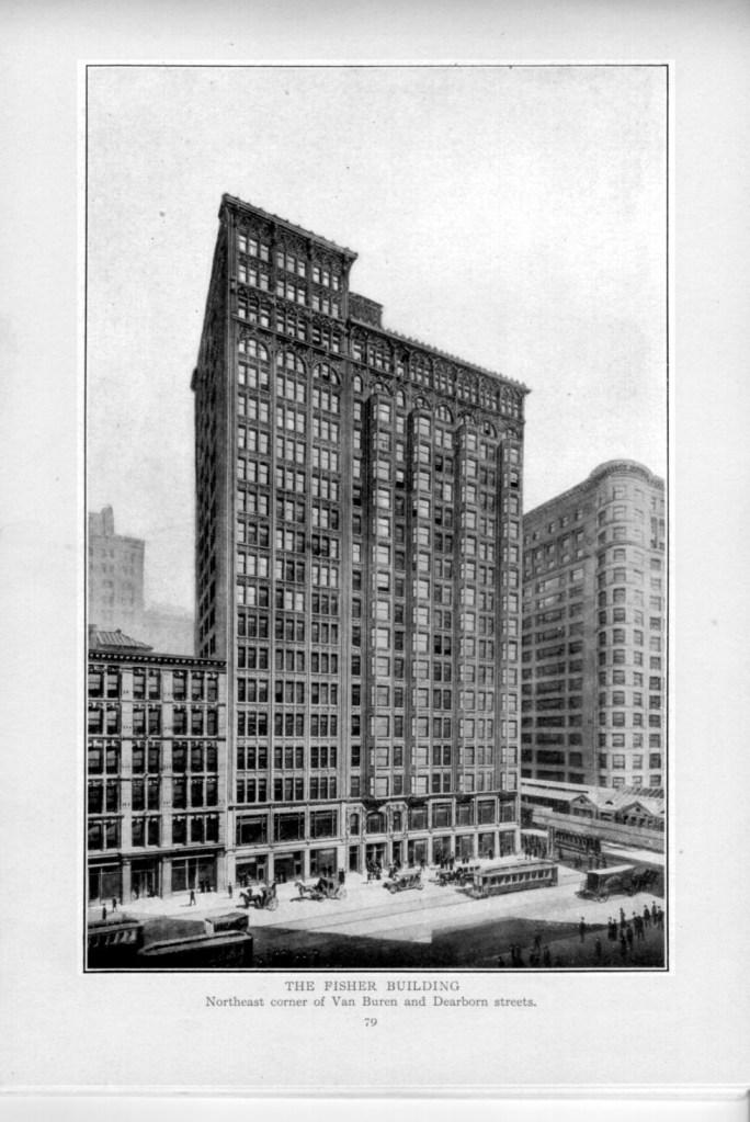 Atwood’s last building for Burnham before his death from opium addiction (seriously!) in 1895 was the Fisher, at the corner of Dearborn and Van Buren. The Fisher had just one party wall because of its narrow lot, and its client, Lucius Fisher, fully intended to buy out his neighbor and expand. The party wall was thus made of lightweight, enameled terra cotta instead of brick.