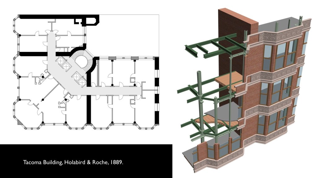 The problem of space-gobbling masonry shear walls was solved when steel became commercially viable around the time of the Tacoma’s opening. Its ductility allowed for precise drilling–not possible with brittle cast iron–and riveted connections that could match the tight joints of expensive wrought-iron railway bridges that had been built throughout the West in the 1880s. Jenney himself described the vertical cantilever trusses of his 1891 Manhattan Building in exactly this way–they were “built like bridges,” he said, comparing the Manhattan’s wind bracing scheme to a giant truss bridge set on its end.