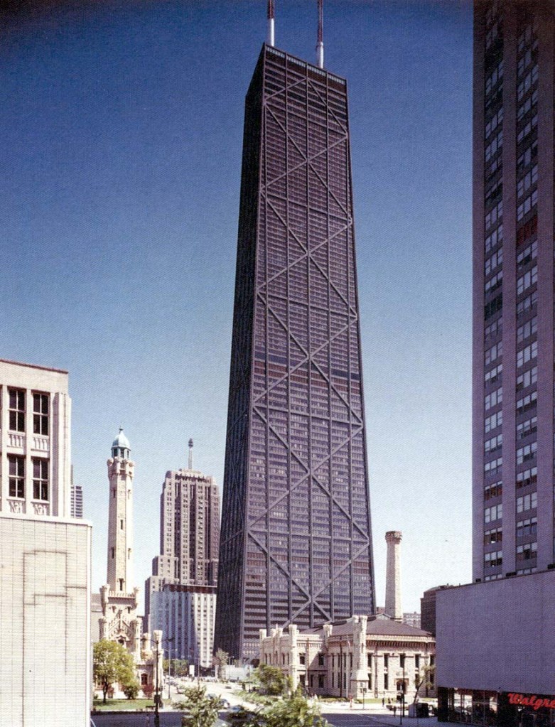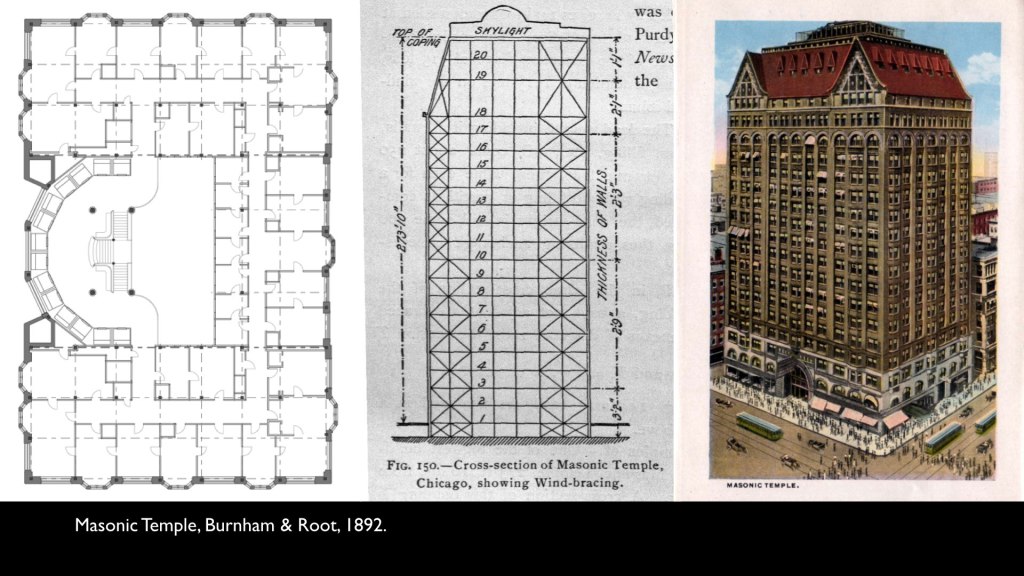 Burnham and Root’s 1892 Masonic Temple Building, at Randolph and Washington, was the most dramatic example of such a wind truss–it was for a short while arguably the world’s tallest building, and its wind bracing system made it, for some historians, a prime contender for a “first.” But Root’s preference for a heavy, Richardsonian Romanesque meant that it was clad in a brick and stone exterior–a “veneer,” in the words of the New York Times, which argued that such a combination was a typically Chicagoan effort at throwing up a cheap, flimsy structure that only pretended to be sturdy and monumental.