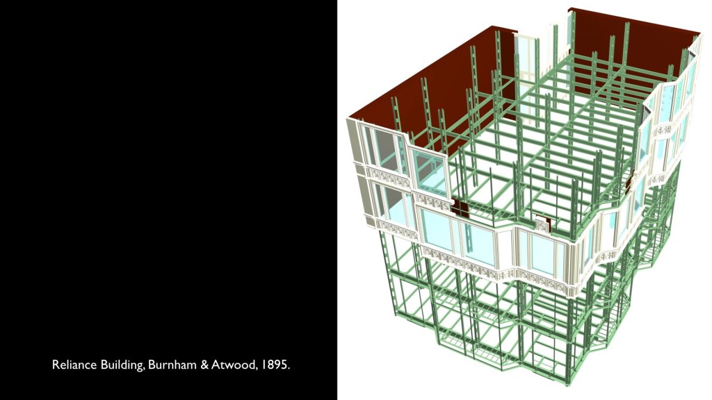 Root’s successor, Charles Atwood, took a different approach to the exterior of the three skyscrapers he designed as Burnham’s partner. With a new material–enameled terra cotta–and a glut of cheap plate glass from factories in central Indiana, Atwood designed the Reliance Building in a vertical Gothic style, detailing tight terra cotta cladding around a moment frame designed by engineer E.C. Shankland that eliminated the diagonals of earlier wind trusses, replacing them with stiff, riveted connections between oversized columns and girders that spread wind loads throughout a network of steel elements. The Reliance was certainly remarkable in its light, transparent appearance–New York critic Barr Ferree wrote, horrified, that the Reliance was: