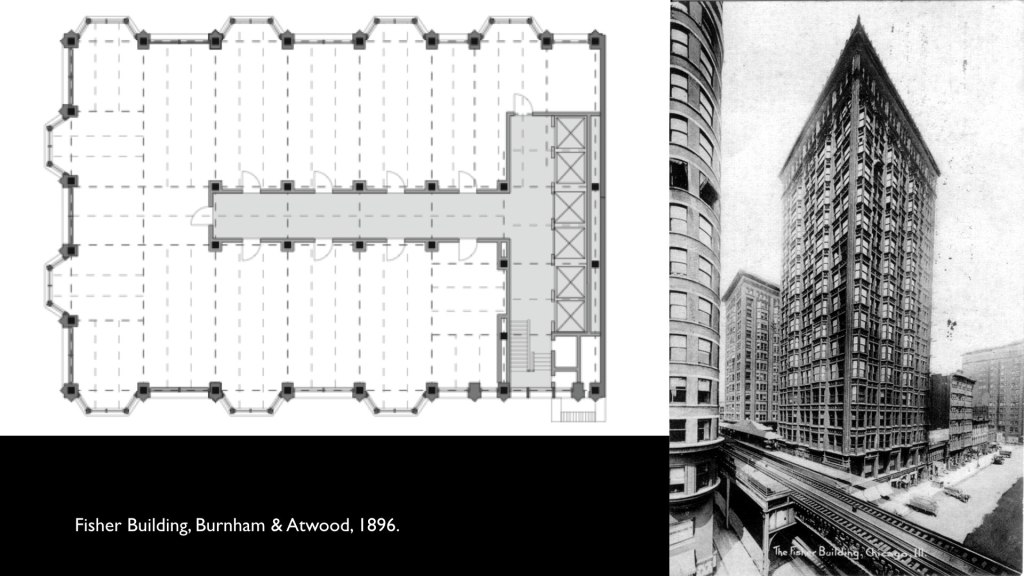 The skeletal appearance of the Fisher impressed Inland as the culmination of advances that had appeared over the previous generation: steel framing, wind bracing, and curtain walls. With its self-braced, skeletal steel structure and its transparent cladding, the Fisher represented the first comprehensive collection of modern skyscraper techniques that had been deployed piecemeal in earlier buildings. “If they have dispensed with front walls, they have retained often rear walls and those adjacent to other property,” Inland noted of previous skyscrapers, a direct reference to the Reliance.