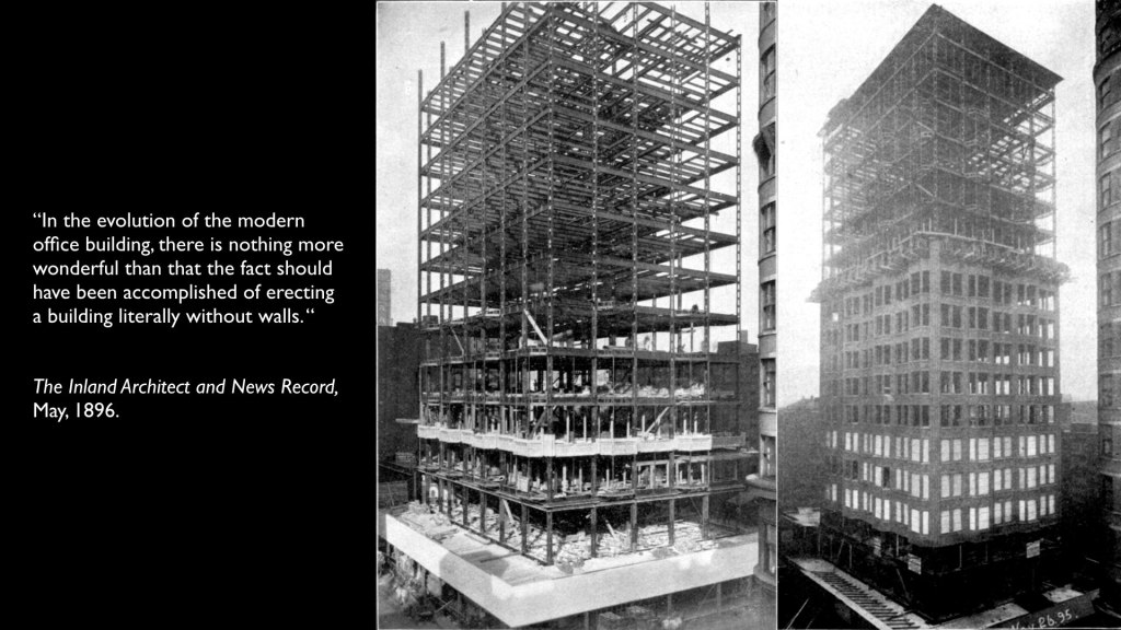 It’s that last bit that I find most interesting–that the “modern skeleton building” consists of “curtain walls and steel wind bracing.” I’d argue that’s as good a formula as any for the “modern skyscraper,” and if you had to pick a building that exemplified this combination first, you’d look at several possibilities.