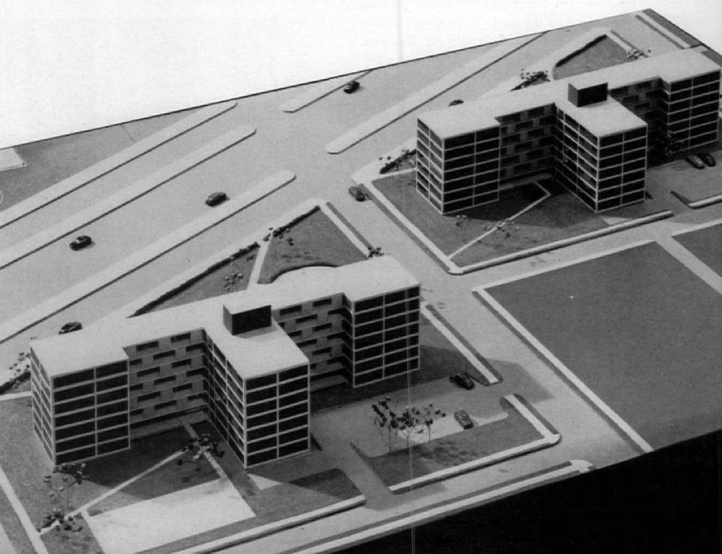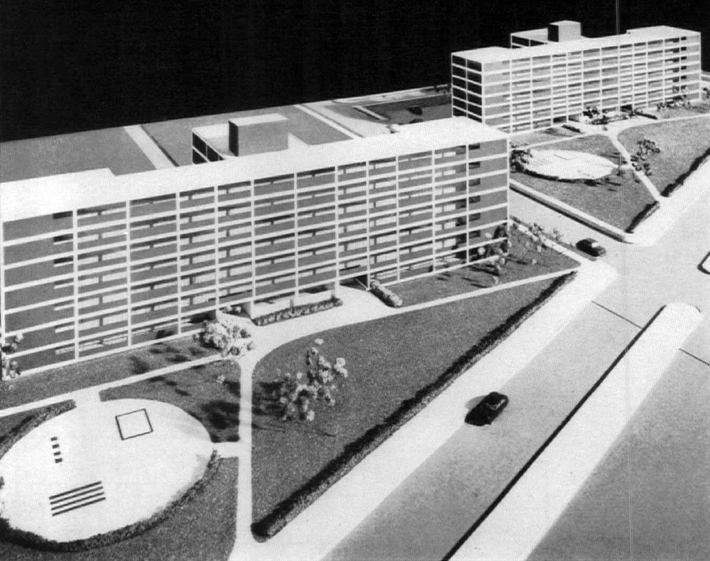 โPhotographs…show the unusual skill with which the exposed skeleton of hard-surfaced, self-finished concrete has been integrated decoratively with the plan and with other materials.ย Columns fall between alternating bays of living rooms and bedrooms, so that strings of aluminum windows, continuous from column to column, vary in sill height according to whether the space inside is a bedroom or a living room.ย Red brick filler panels, contrasting with gray frame, can be laid from inside without scaffolding.ย The access balconies or porches seen in photo below are semi-sheltered upstairsโ sidewalks, faced with alternating panels 4-in. glazed tile and of open-wire, floor-to-ceiling fence.ย These areas serve as rainy-day recreation space (conveniently supervised…from kitchens);