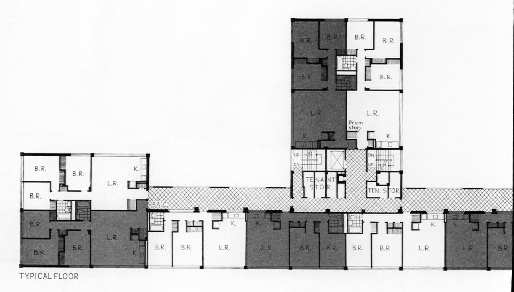 Still, the key design feature of SOM’s plan lay not in its exposed materials or its proposed (though apparently never installed) program of glazed tile ornament, but rather the simplicity and targeted thoughtfulness of its plan. While six apartments on each floor were clustered into pods that inhibited cross-ventilation, their arrangement in conjunction with two pairs of linear apartments meant that each gallery could be seen from four kitchens, the idea being that children playing on these eight-foot-wide balconies could be supervised by parents while they were preparing meals. Similarly, each apartment had room to store a pram, and storage for each tenant was provided immediately adjacent to the elevators, making trips to and from the ground-level playgrounds relatively efficient.