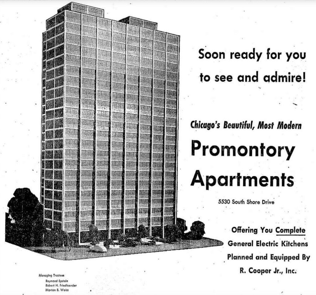 The Mies buildings are well known, of course, but they’re rarely recognized for how inexpensive they were to build (more to come on those; the Promontory and 860-880 stories are a lot richer than the textbooks make them out to be). Promontory, in particular, used rudimentary, almost primitive concrete and masonry techniques for its construction, eschewing the stone or finish brick that was expected for any apartment block of the era. Completed in 1949, half of its units sold before construction started, proving that modern design and raw material expression had untapped market potential.