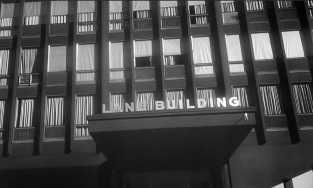 But it’s a brief, five-second cameo that caught my eye, especially as someone who’s slightly obsessive about architectural cameos. Thirty minutes into the film, Frankie Machine gets dressed up in a suit and bow tie and interviews with Harry Lane, a musical agent. And where is Lane’s agency based? Why, in the well-known Lane Building, which I’m guessing is located in the 800 block of North Lake Shore Drive:
