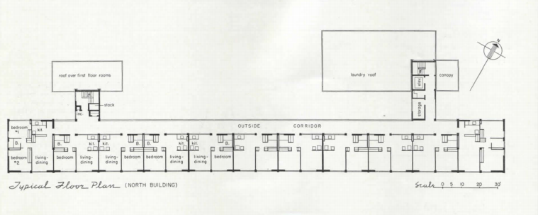 Finally, Archer Courts (1951-52), along Archer Avenue at Cermak Road, were designed by Everett F. Quinn & Associates with Alfred L. Mell. (Figure 07) The two thin, gallery-plan slabs included three-bedroom units on the bottom two stories, with single-level units above, all contained within just a 21’ depth. This allowed cross-ventilation, but it also required no intermediate girders, simplifying formwork and allowing for exposed concrete ceilings. Archer Courts won praise for their “clarity and orderliness” and angled solar orientation.[xx] At $10,270 per unit, they were expensive, but they proved more functional and successful than their contemporaries.[xxi]