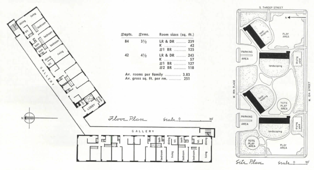 Ogden Courts (1951-52), designed by SOM, were planned around similar galleries, but they also borrowed exposed construction techniques used by Mies van der Rohe in Promontory Apartments (1949).[xvii] Promontory was developed by Herbert Greenwald, a mentee of Henry Holsman, whose expertise had been so critical to the Cabrini Row Houses. Holsman served as a consultant on Promontory and was influential in refining its budget-conscious palette, another economic achievement that convinced the CHA that materials frankly expressed–or, in other words, left bare–could serve as architectural finishes. Ogden Courts’s exposed frame used dense, water-resistant concrete, which also formed bare flat slabs to create durable architectural ceilings within. The “building straight” approach, inspired by Promontory but with its roots in Holsman’s work at Cabrini, required “neither veneer nor paint,” and at just $9400 per unit, Ogden Courts set a formidably low bar for future CHA buildings and budgets.[xviii] Prairie Courts (1950-52), designed by Keck and Keck, deployed galleries with elevator cores at their 1/3 points in two 14-story buildings, while several seven-story blocks were arranged around continuous galleries with a single elevator core in the center. Apartments in these buildings had just one or two bedrooms, while lower row house blocks accommodated three- to five-bedroom units that offered immediate outdoor access.[xix]