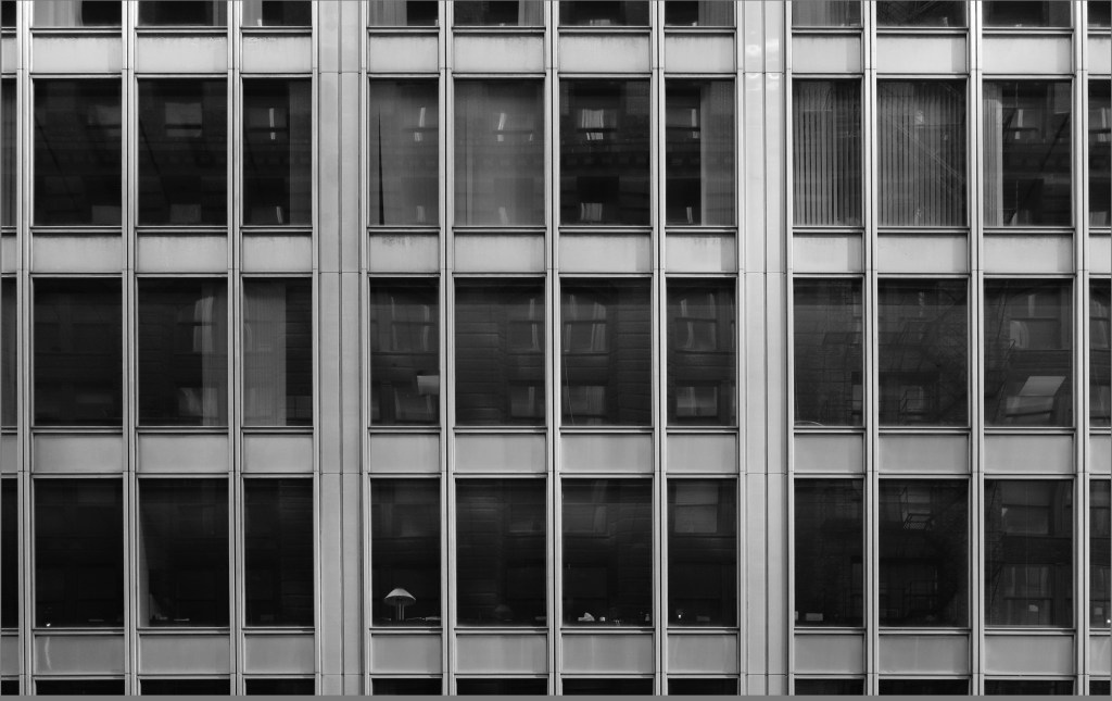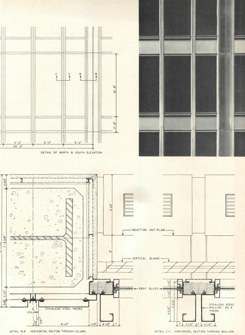 And, about that curtain wall. Like Inland, it’s made of stainless steel, but detailed to eliminate the characteristic ‘oil canning’ that gives Inland’s elevations their shimmering character. Harris’s detailing is all about rigidity, folding thin sheets of steel at their edges to provide a firm edge and prevent the small variations that catch daylight so strikingly at Inland. This gives the wall some greater depth–and notice how Netsch picked up the Miesian trick of regularizing the centerlines of the columns and mullions, with slightly narrower windows at the ends of each bay: