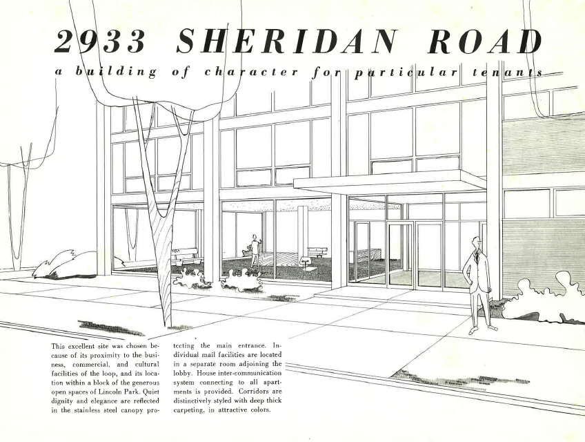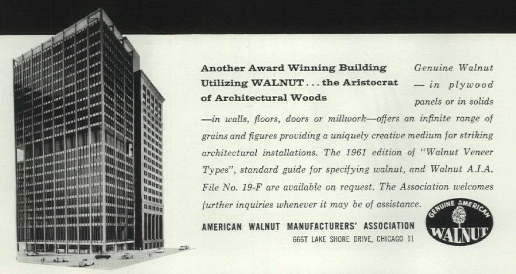 This was big news–“the first building to be erected inside the Loop in more than 20 years,” claimed Tribune real estate editor Al Chase (pace, Prudential–you’re not in the Loop, you’re Loop-adjacent). Skidmore, Owings, and Merrill were announced as architects, and they produced a sketch of the proposed square tower–an elegant prism up on piloti that reflected their emerging Miesian vocabulary: