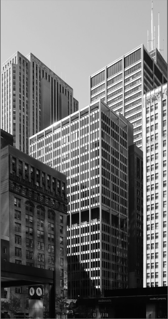 Designed by Walter Netsch–after being replaced on the Inland Steel project and finishing design work on the iconic Air Force Academy design–Harris continued some of that building’s themes. While its columns are buried behind its steel-and-glass curtain wall, its mechanical zone is clearly delineated at the 11th and 12th floors, showing Netsch’s continued interest in expressing building services. Harris’ core was integrated with the elevators in the original, 1911 building, giving it a ‘side saddle’ arrangement that SOM’s New York office was pursuing in their design for the Park Avenue headquarters of Pepsi-Cola at roughly the same time.