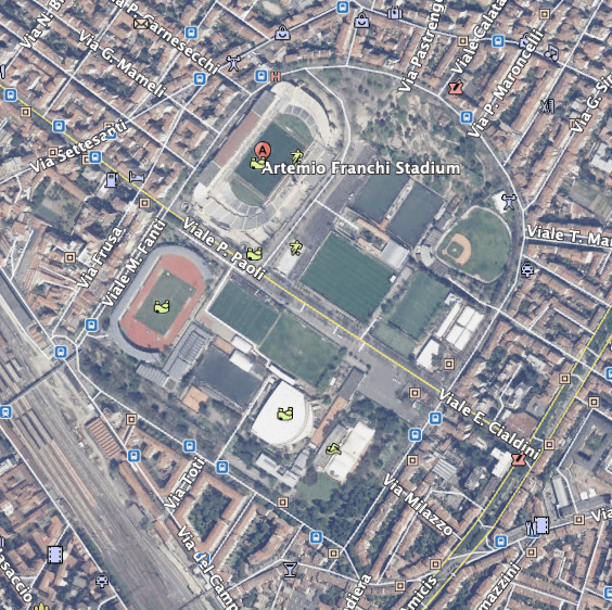 One possibility that the city may consider is an idea that has been informally floated regarding the larger site of the Franchi, Florence’s Campo Marte, still nominally a military practice ground northeast of the central city. Since the construction of Nervi’s stadium on it in 1931-32, the 40-hectare site has accumulated a cluster of sports facilities, including a 1990 stadium custom built for track and field events after the Franchi’s track was removed to accommodate World Cup games. That stadium, the Stadio Luigi Ridolfi sits on a smaller footprint, but has no historic value and is located across the street from the platforms of the city’s second rail station (the one you go through before you arrive at Santa Maria Novella if you’re coming from Rome).