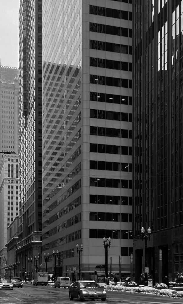 While Keane and Feinberg were in prison, another Jefferson State Bank project 2 N. La Salle, got another sweetheart deal. In the photo above, you can see that there’s a substantial setback between 2 N. La Salle (the white-skinned building) and 30 N. La Salle, the more sinister looking one, which is what Chicago got on the site of Sullivan’s Stock Exchange, but that’s another post. There had been a zoning provision for new construction on La Salle that required a 20-foot setback, as the city’s Bureau of Street Traffic planned to widen La Salle at some point–the idea being that, as all of the obsolete structures on the street were inevitably torn down and replaced with new towers, they’d end up with plenty of room to add high-speed lanes. (Let that sink in–it would have included the Rookery, Jenney’s New York Life, and the Field Building…) 30 N. La Salle complied with the setback but, “somehow,” Feinberg’s 2 N. La Salle got a waiver, despite the Bureau of Street Traffic’s objections, meaning that with one zoning appeal the entire La Salle Street widening project was (thankfully) dead. Alderman Ed Vrdolyak tried to repeal the variance, noting that the jailed Feinberg had quickly transferred land ownership to his brother on entering prison, but Keane’s influence, even from behind bars, was significant, and you can see the results on La Salle Street today.