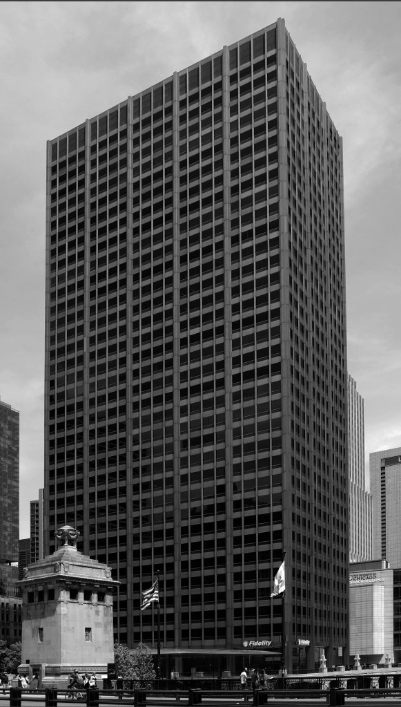 The Sanborn map above shows a block in the old Market district at the SW corner of the Loop. The manufacturing and warehousing buildings on that block persisted even as the wholesale market moved to its current site on the southwest side beginning in the 1940s, but largely fell into disrepair. In the 1960s, a trio of investors calling themselves Fleetwood Realty began quietly buying lots on the block, trying to assemble a large enough parcel to sell to a prospective developer or corporation. Insurance companies and other large corporations had been building on Wacker Drive (Market Street in the map above) since the mid-1950s; America Fore, Mutual Trust, Sinclair Oil all built headquarters on the boulevard. Hartford Insurance built two. More investment came with the Gateway Center buildings across the River and U.S. Gypsum’s rotated crystalline extravaganza in 1963-65. Fleetwood’s acquisitions were well-considered–the site was within walking distance of Union and Northwestern Stations to the west, the El loop to the east, and Congress Expressway to the south.