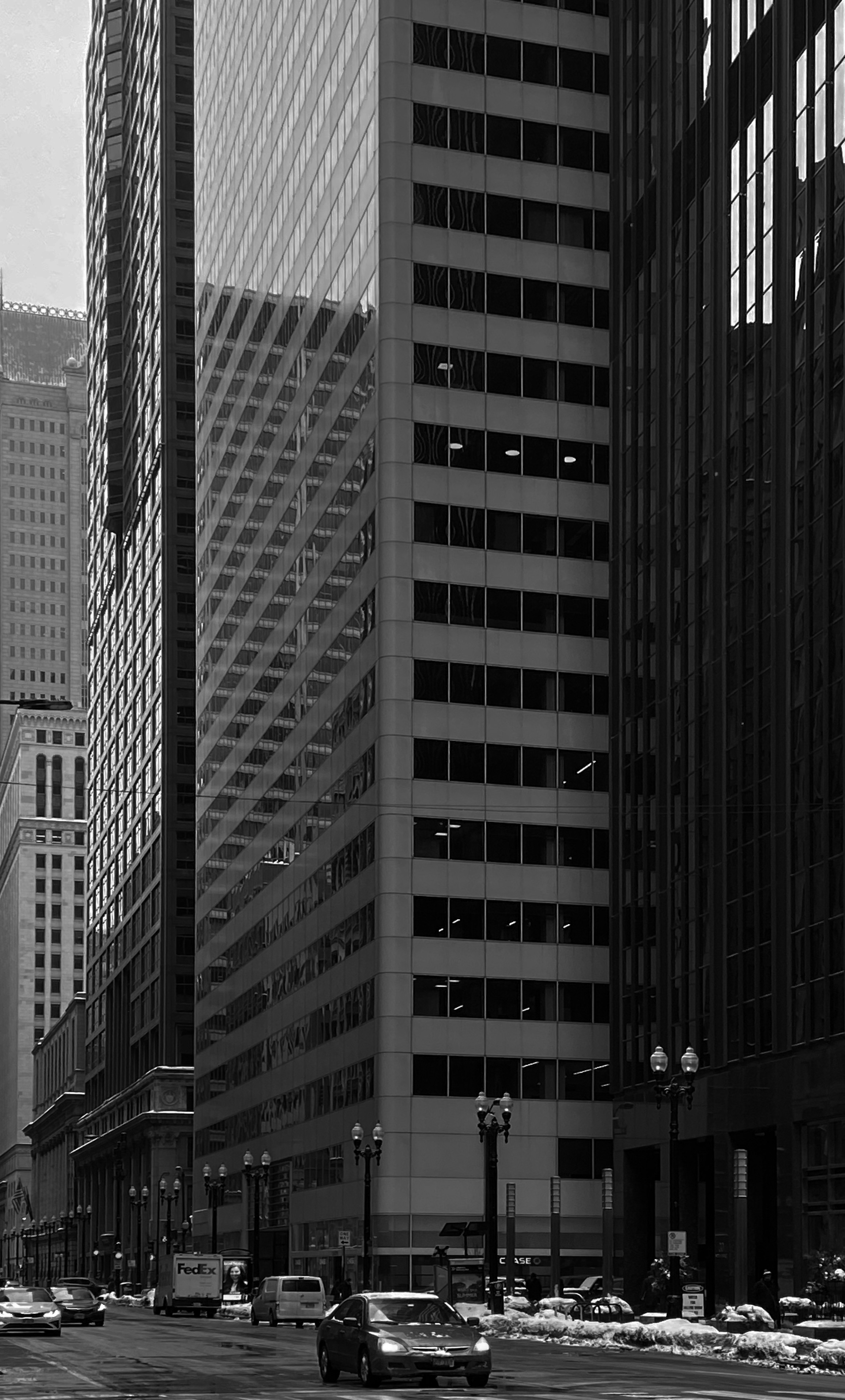 While Keane and Feinberg were in prison, another Jefferson State Bank project 2 N. La Salle, got another sweetheart deal. In the photo above, you can see that there’s a substantial setback between 2 N. La Salle (the white-skinned building) and 30 N. La Salle, the more sinister looking one, which is what Chicago got on the site of Sullivan’s Stock Exchange, but that’s another post. There had been a zoning provision for new construction on La Salle that required a 20-foot setback, as the city’s Bureau of Street Traffic planned to widen La Salle at some point–the idea being that, as all of the obsolete structures on the street were inevitably torn down and replaced with new towers, they’d end up with plenty of room to add high-speed lanes. (Let that sink in–it would have included the Rookery, Jenney’s New York Life, and the Field Building…) 30 N. La Salle complied with the setback but, “somehow,” Feinberg’s 2 N. La Salle got a waiver, despite the Bureau of Street Traffic’s objections, meaning that with one zoning appeal the entire La Salle Street widening project was (thankfully) dead. Alderman Ed Vrdolyak tried to repeal the variance, noting that the jailed Feinberg had quickly transferred land ownership to his brother on entering prison, but Keane’s influence, even from behind bars, was significant, and you can see the results on La Salle Street today.