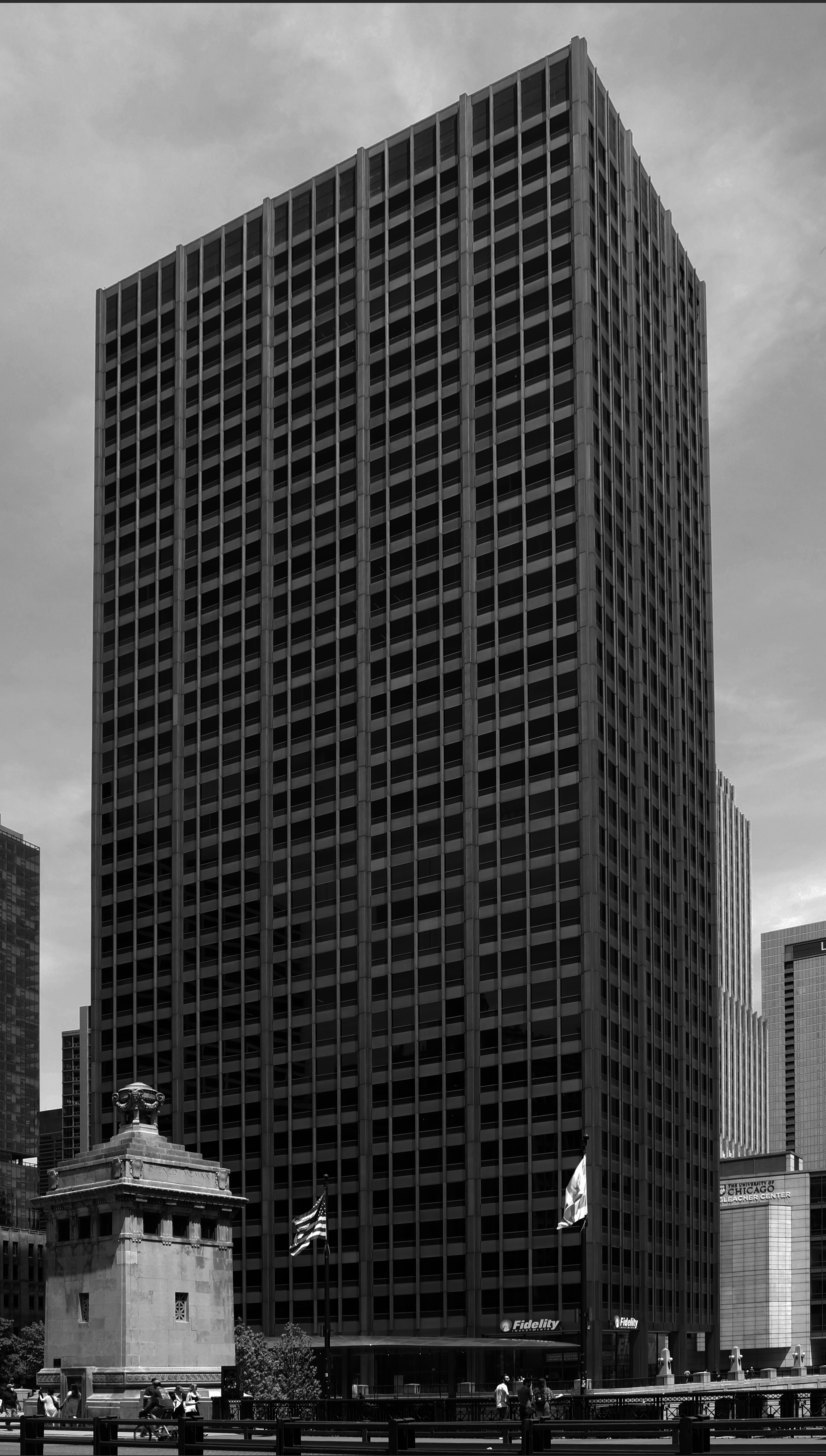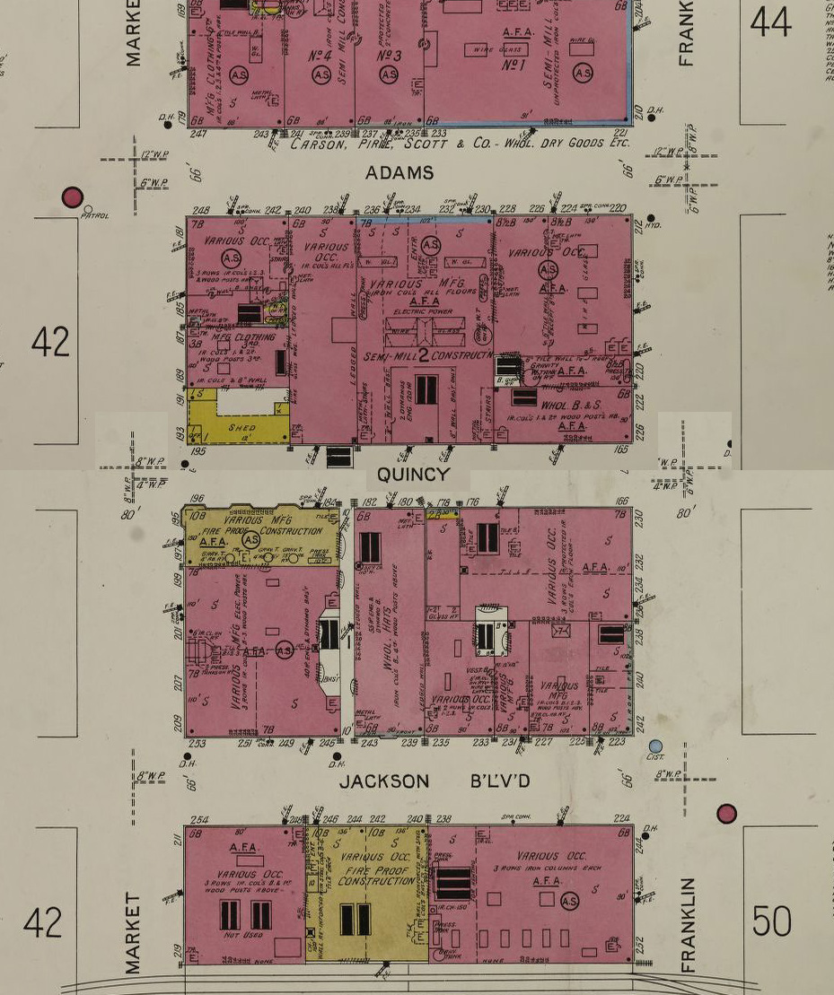 The Sanborn map above shows a block in the old Market district at the SW corner of the Loop. The manufacturing and warehousing buildings on that block persisted even as the wholesale market moved to its current site on the southwest side beginning in the 1940s, but largely fell into disrepair. In the 1960s, a trio of investors calling themselves Fleetwood Realty began quietly buying lots on the block, trying to assemble a large enough parcel to sell to a prospective developer or corporation. Insurance companies and other large corporations had been building on Wacker Drive (Market Street in the map above) since the mid-1950s; America Fore, Mutual Trust, Sinclair Oil all built headquarters on the boulevard. Hartford Insurance built two. More investment came with the Gateway Center buildings across the River and U.S. Gypsum’s rotated crystalline extravaganza in 1963-65. Fleetwood’s acquisitions were well-considered–the site was within walking distance of Union and Northwestern Stations to the west, the El loop to the east, and Congress Expressway to the south.