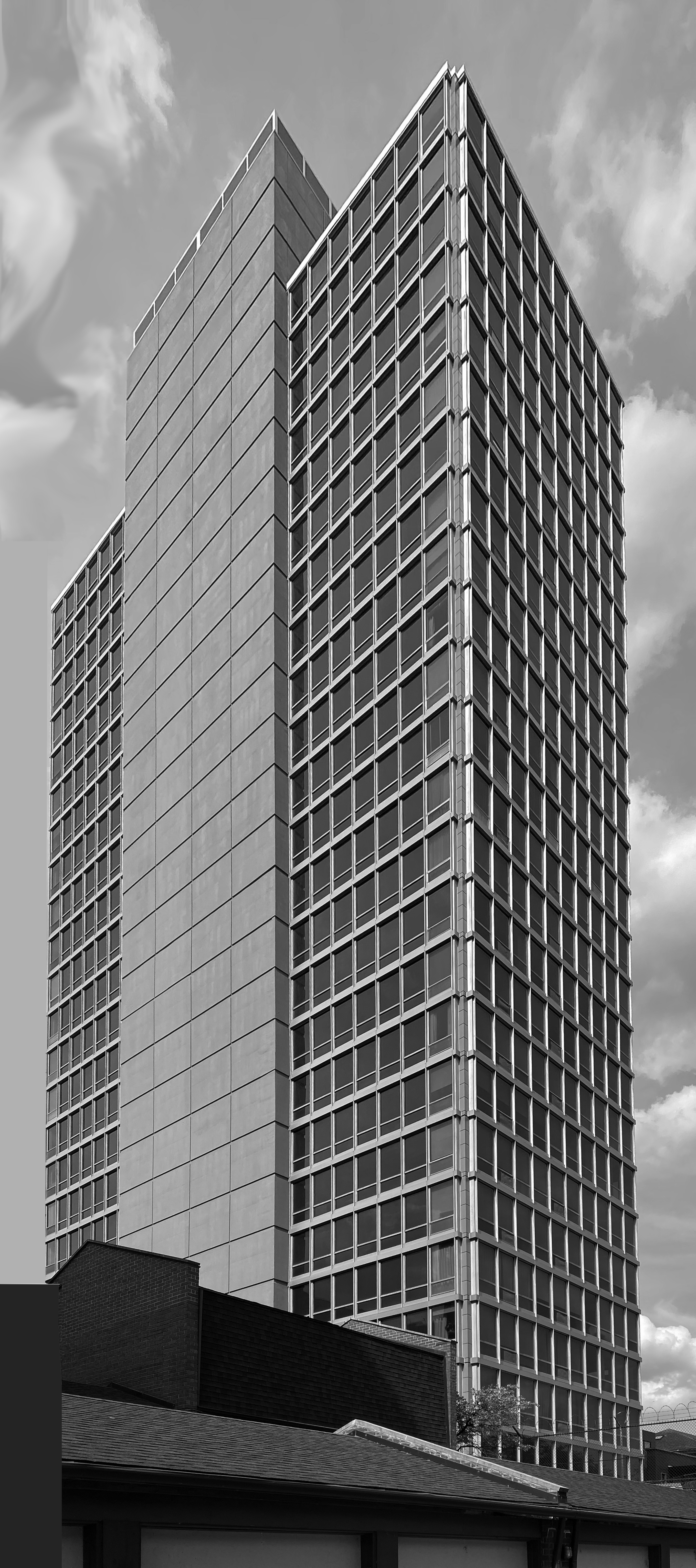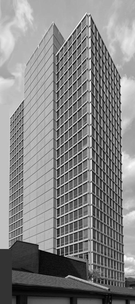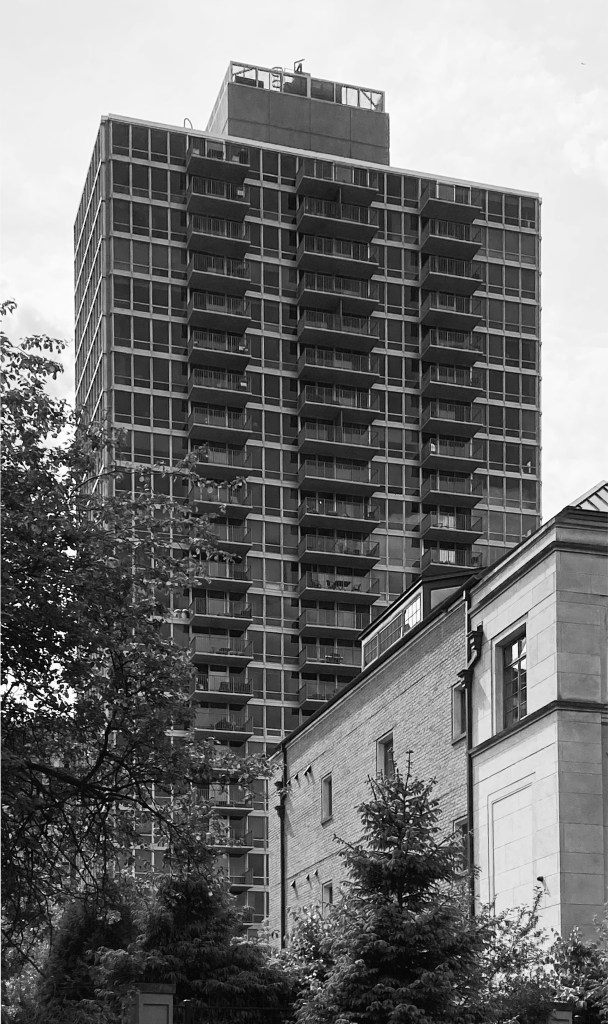 Hoffman’s efforts to replicate the perceived comforts and conveniences of the suburbs along Lake Shore Drive led to a building designed by Fridstein and Fitch, a firm opened by Loebl, Schlossman, and Bennett partner Marvin Fitch in 1951. Their site on a suburban-sounding “quiet, shaded street” offered unrestricted views to Lincoln Park and the lake, and Fridstein and Fitch arranged the building’s massing accordingly, with an exposed core on the building’s west side that allowed every apartment eastward-looking views and balconies. Each unit was larger than standard north side apartments, at between 1000 and 2000 square feet, with large living rooms and separate dining rooms; each floor of the 26-story structure had just two or three units, which sold for between $25,000 and $58,000. Taking cues from Mies’ Commonwealth Apartments, just to the southwest, they developed the building’s curtain wall with grey-tinted glass to mitigate bright morning sunshine, set into aluminum mullions that replicated the now-established Miesian idiom.