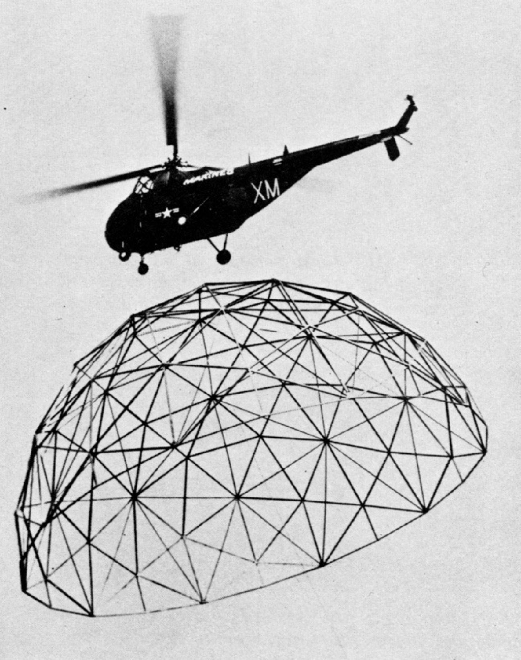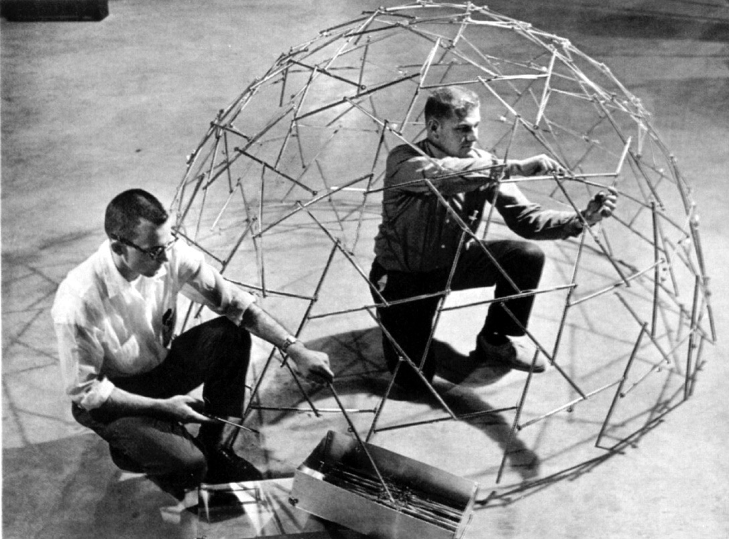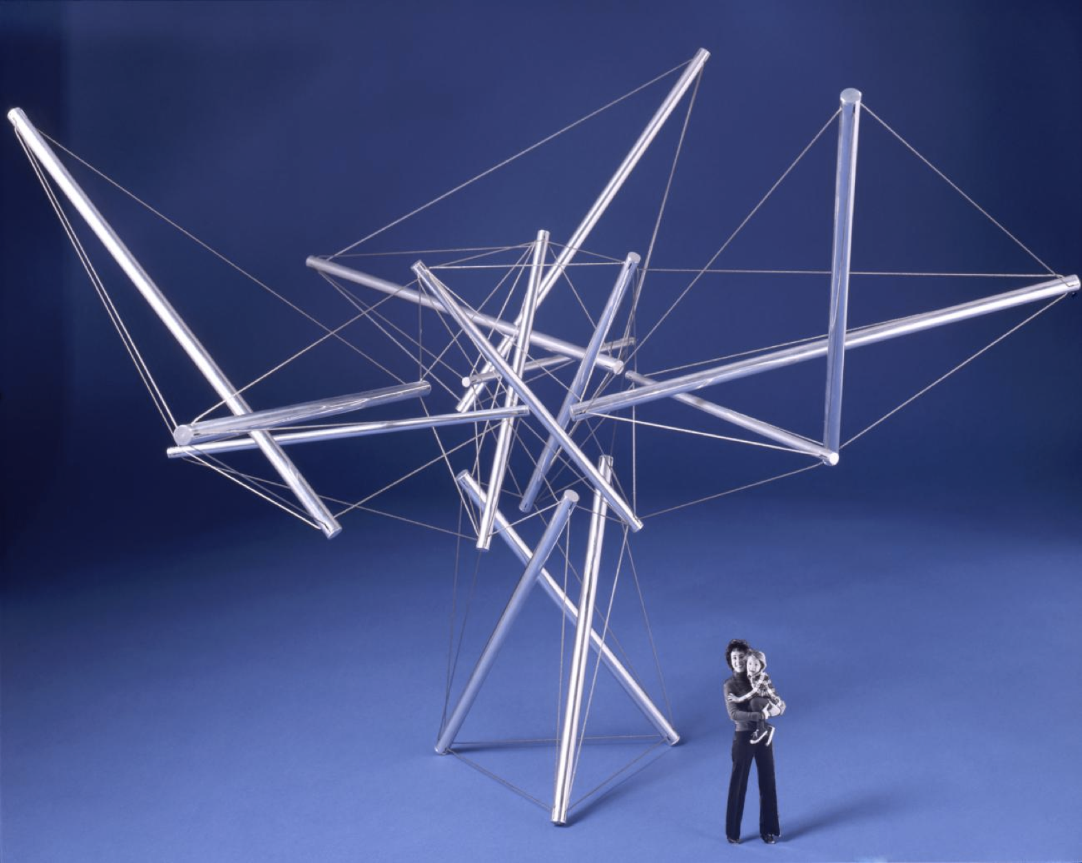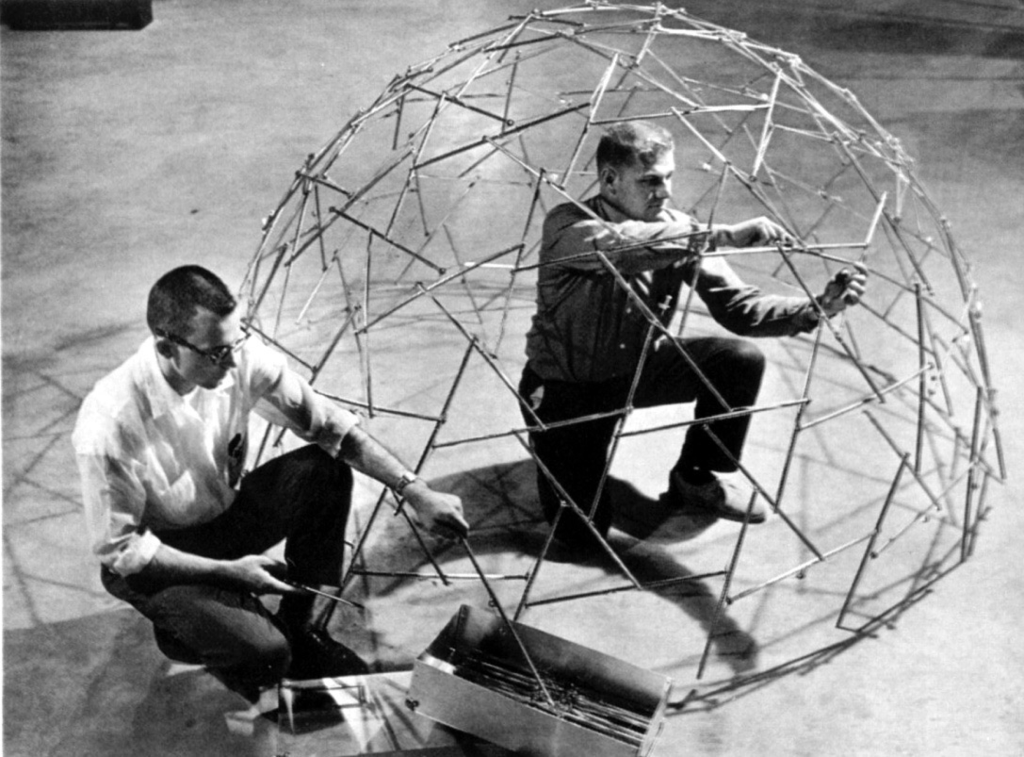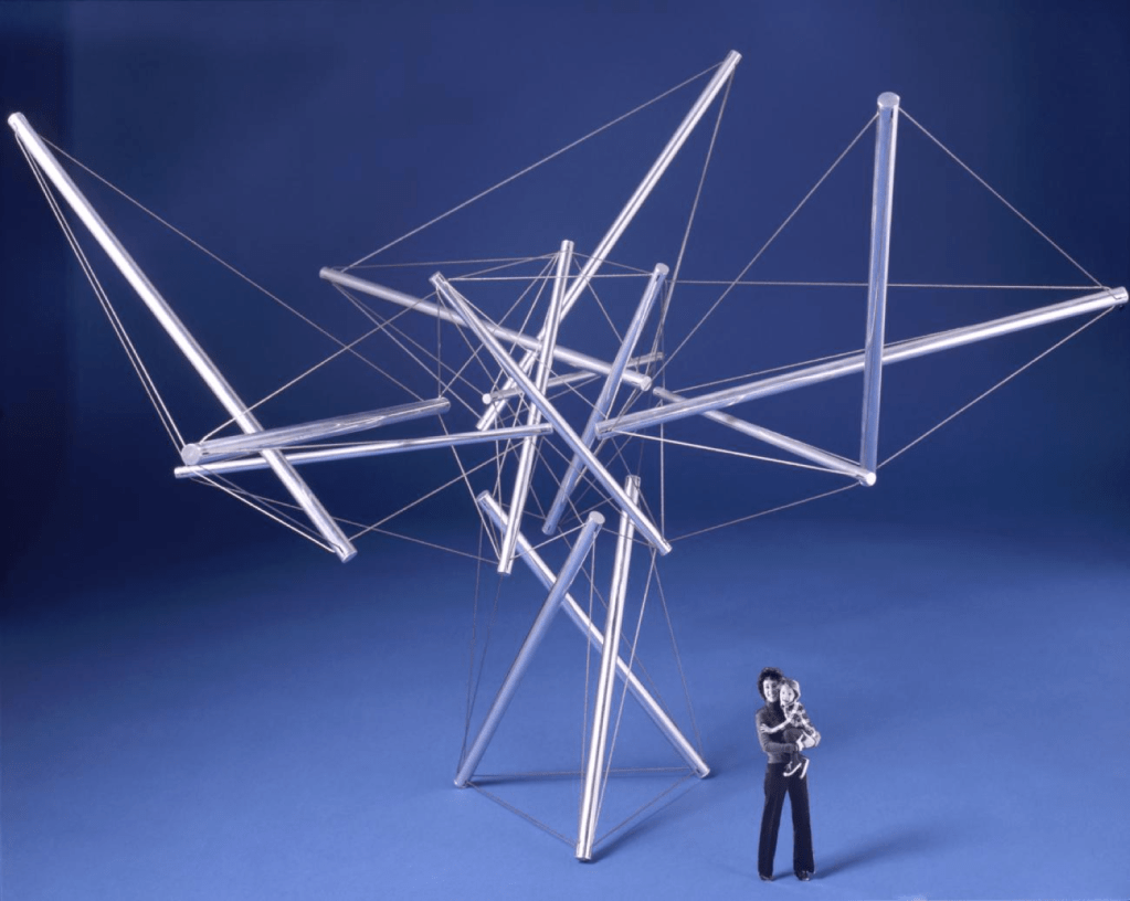 The instigator of this idea was Kenneth Snelson, who went on to a career as a sculptor and consultant for all sorts of projects employing this principle. But Fuller also co-opted it, calling it “tensegrity” and (depending on who you believe) claiming it as his own. While geodesics were a bigger business success, tensegrity ranks higher on the exotic structures spectrum because of the uncanny openness the principle creates: