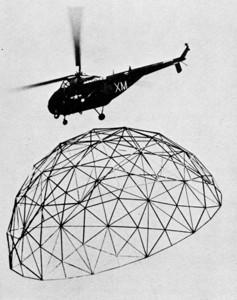 The paradigm for these is the geodesic dome, invented by (or, really, rediscovered, packaged, and marketed by) Bucky Fuller. The evolution of the dome through his initial attempts at Black Mountain College (and, I think, at Chicago’s Institute of Design, but that’s another post), shows a gradual refinement from structures based on flat members arranged in “great circles” that failed, to geometric patterns that arranged nodes around a spherical surface, connected by multiple linear elements. The result was a structure with vast redundancy–like a monolithic concrete structure, a true geodesic presents a nearly incalculable number of potential paths for gravity and lateral forces to take. As a result, it functions very much like a shell structure, but with nearly all of the weight removed.