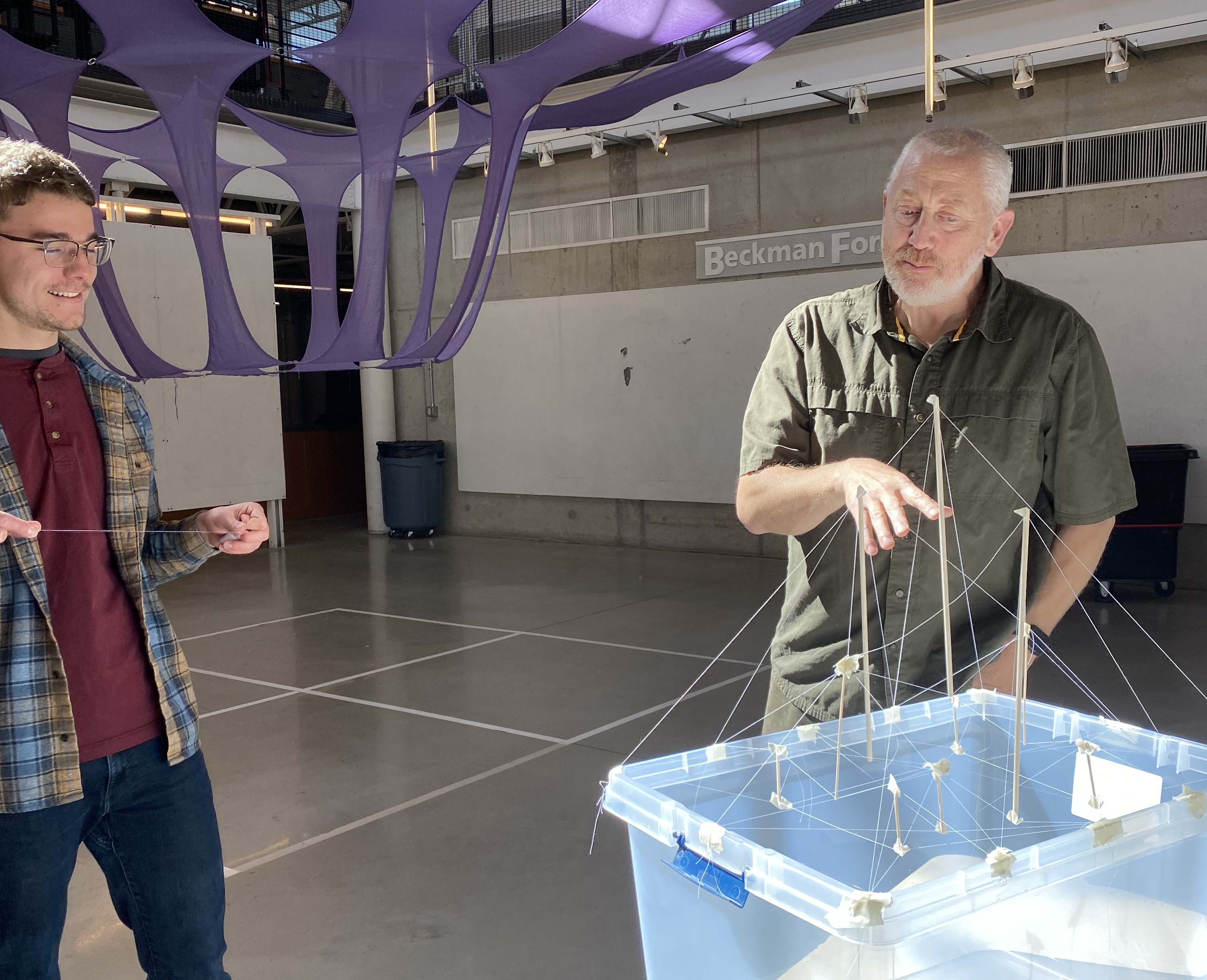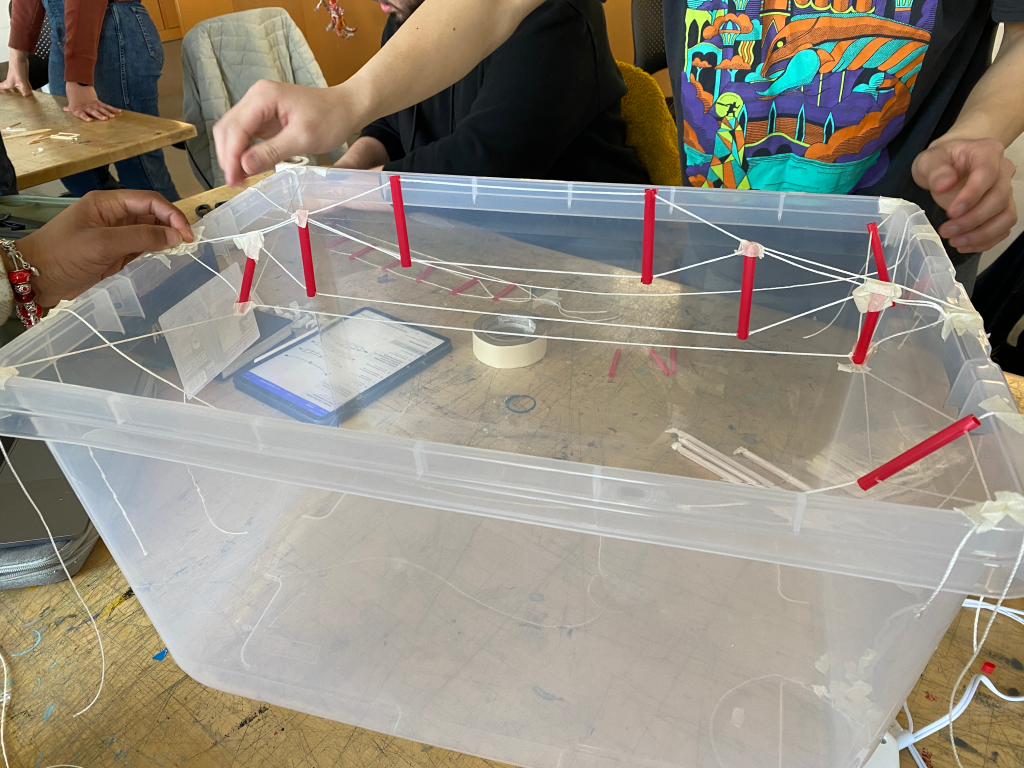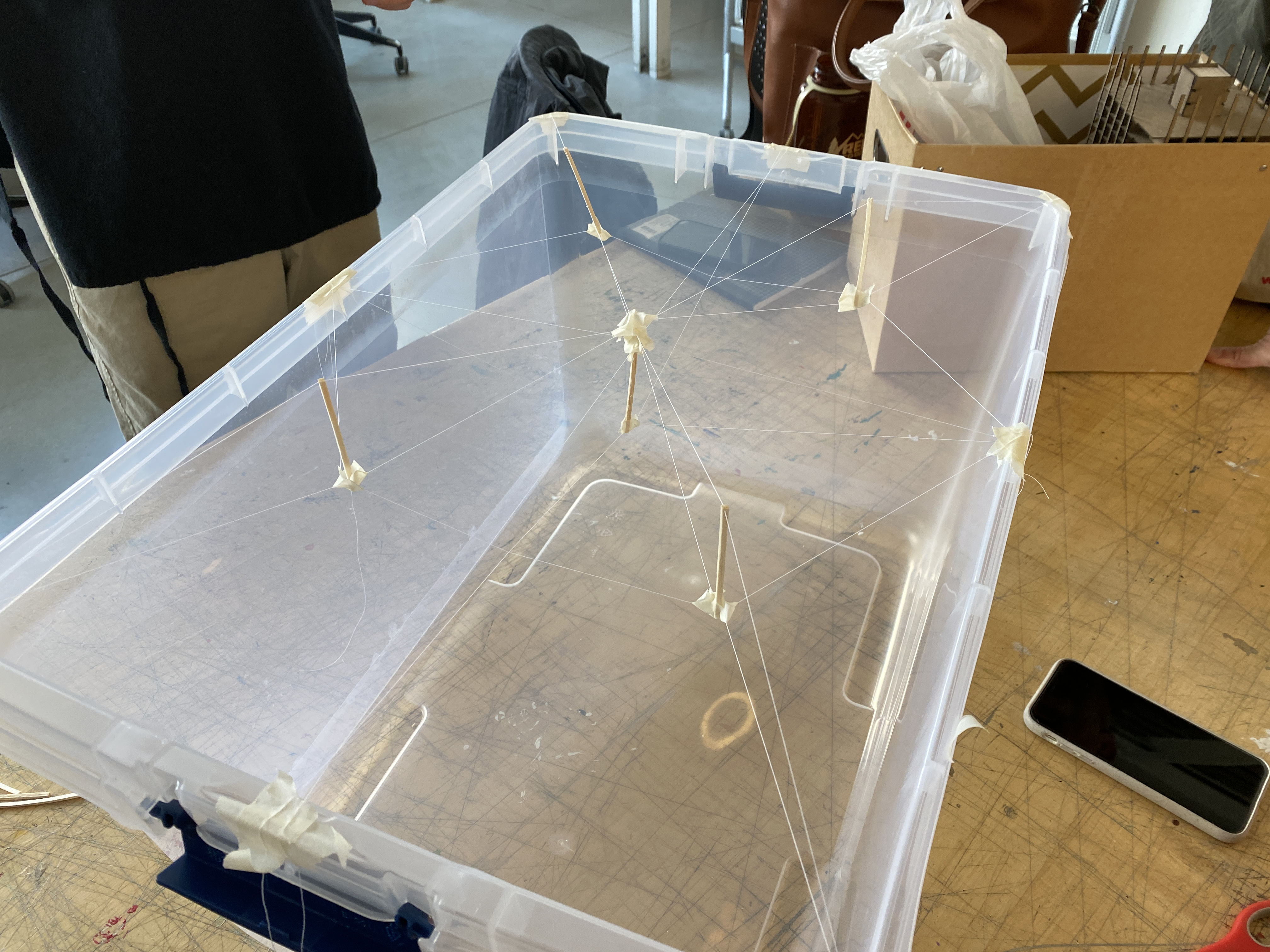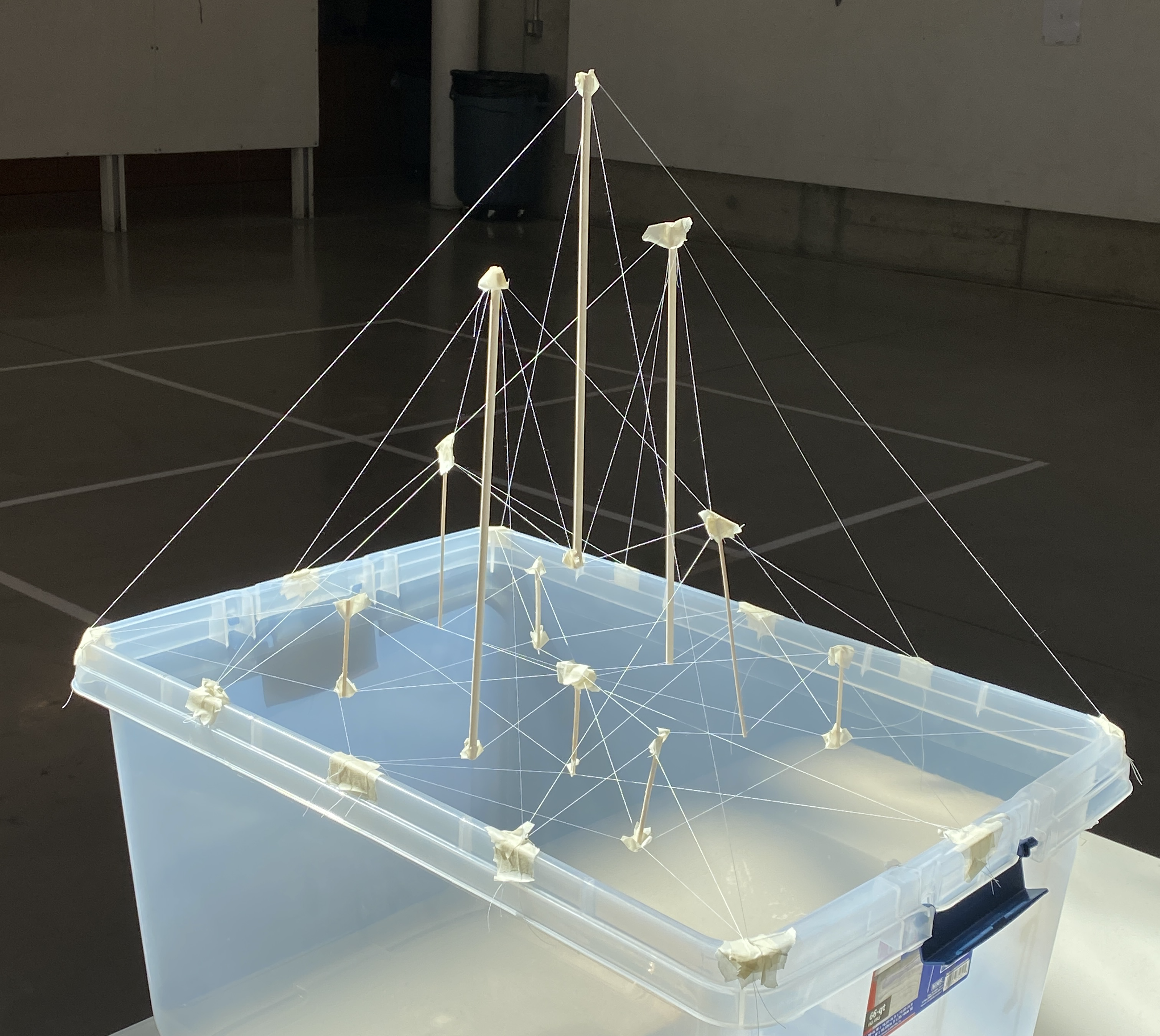 So, on the desktop, using wood stirrer sticks for compression elements, regular string for tension, and duct tape to make joints, you can very quickly and simply build a network of triangulated members, finding stability where you can and fixing points by watching where the structure is floppy or where it feels fixed. Student teams started with sterilite boxes, and quickly realized that the secret to building these is that you have to go down to go up–that some tension elements want to pick up gravity loads by reaching down (thus ensuring that they’ll always be in tension), while you can use the compression elements to gain height–with impressive results. A second ‘family’ of cables stabilizes the compression elements’ upper ends, fixing points of triangles to give the whole structure geometric stability.