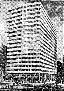 The proposed replacement could not have differed more from the doomed structure’s masonry bearing walls and narrow arched windows. Collins and Tuttle hired New York architect William Lescaze (1896-1969), best known for his PSFS building in Philadelphia, who responded with a horizontally striated curtain wall block with continuous spandrels of gold anodized aluminum, light inset strip windows, and a glazed lobby with black granite interiors. Office space would wrap around a central core containing “air conditioning and high speed electronically controlled elevators,” all for an estimated $12.5 million.[ii]