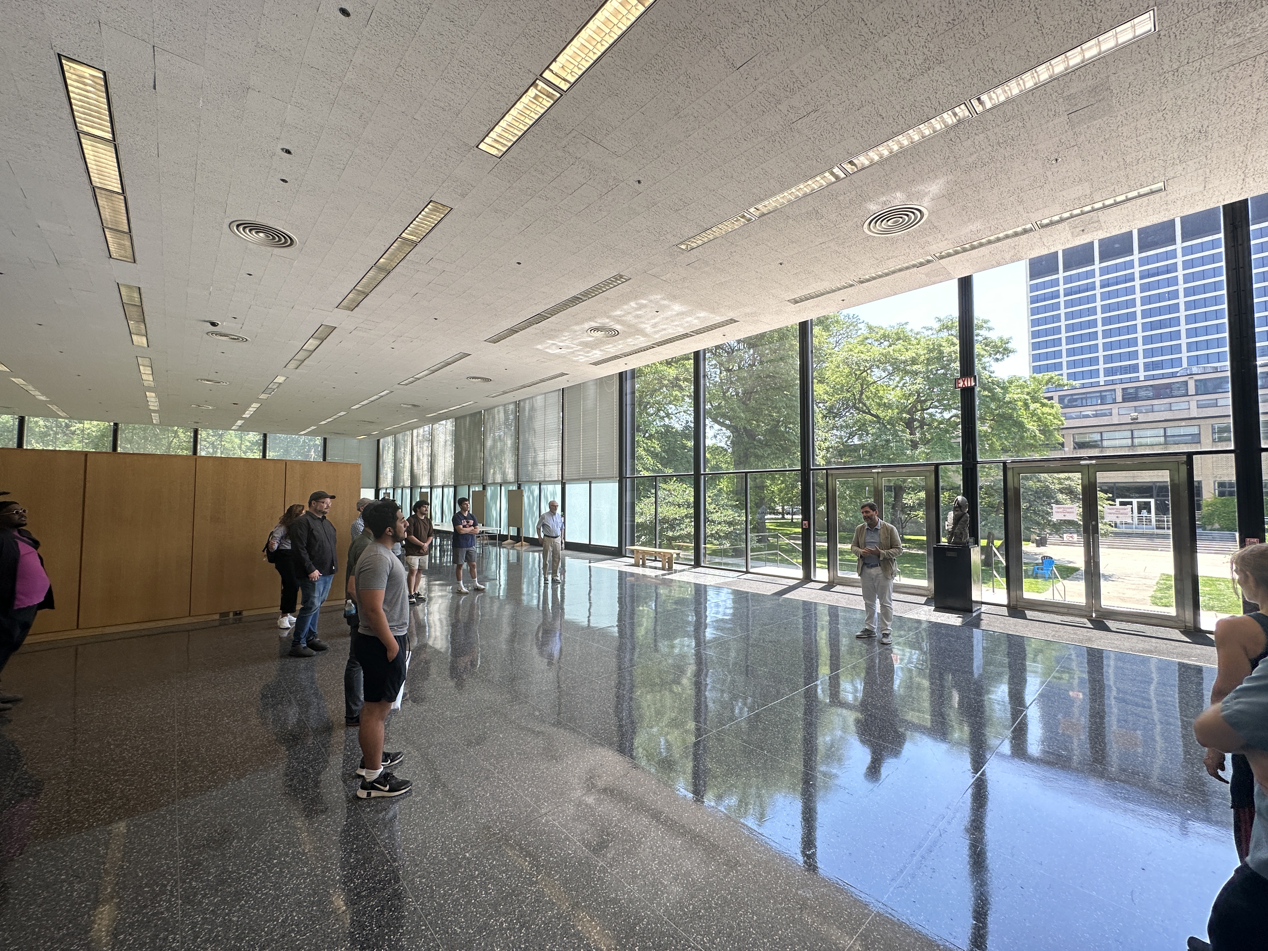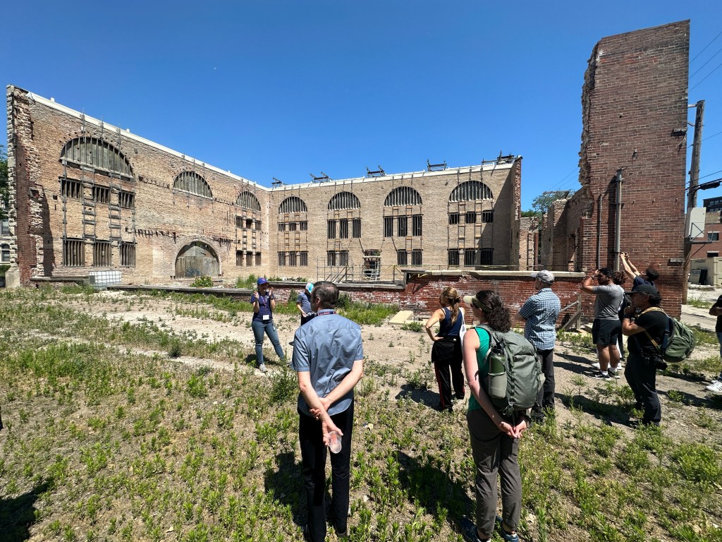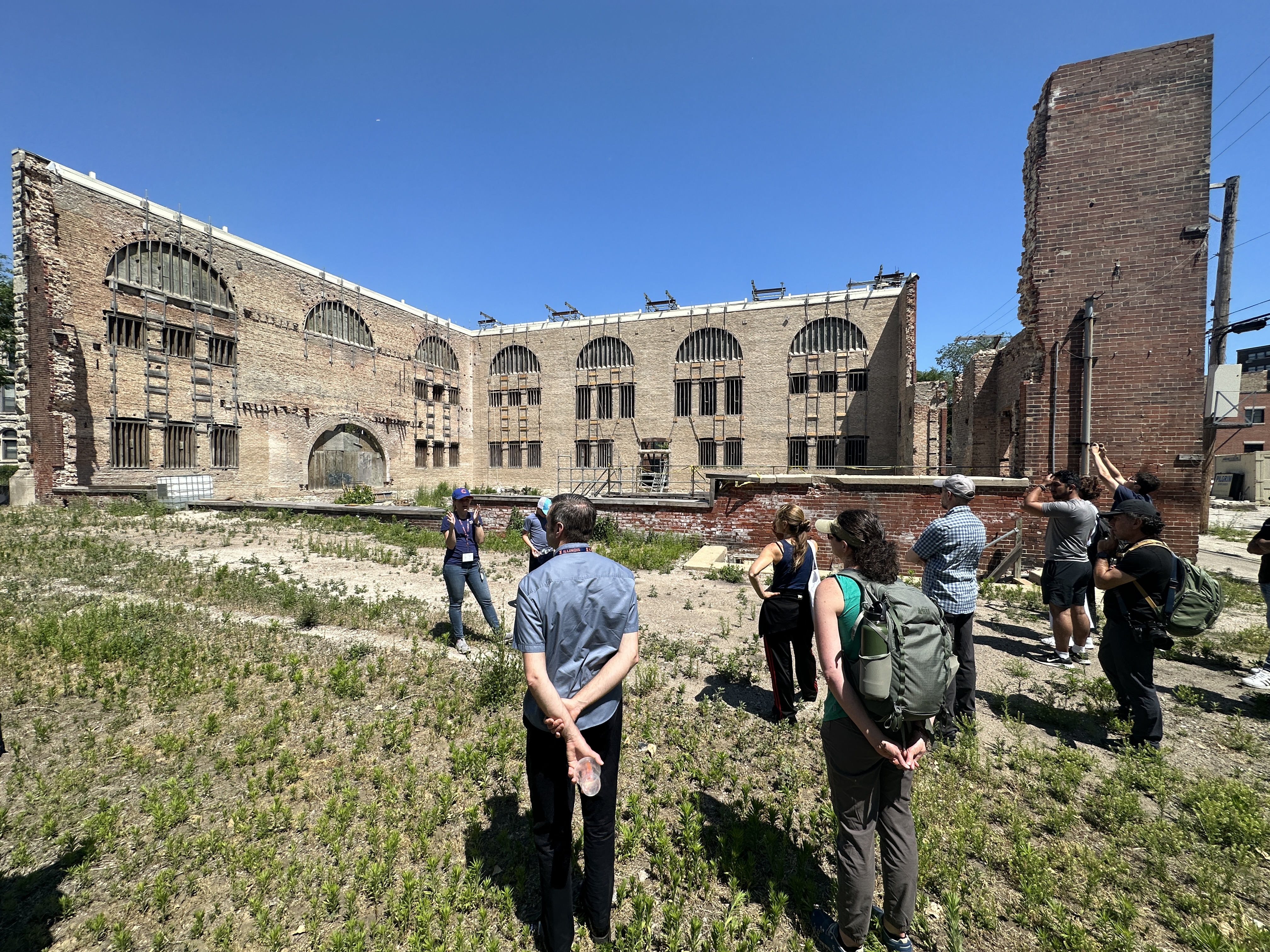 On Saturday we caught an early bus to Chicago to tour four preservation projects in the city, focusing on the South Side, sponsored and led by Wiss, Janney, Elstner and Central Building and Preservation. Pullman, the site of the Spencer Solon Beman-designed factory and company town, was an introduction to the city’s labor and industrial history–a remarkable site of both preservation and transformation. The ruins of Louis Sullivan’s Kehilath Anshe Ma’arav Synagogue–later Pilgrim Baptist Church, the “birthplace of Gospel Music”–was both haunting and promising, as there are hopes that the surviving walls can be incorporated into a new Gospel museum. Michelangelo Sabatino gave us an overview of IIT’s iconic Crown Hall, restored and re-glazed in 2007. Finally, WJE and Central got us up on the sidewalk canopy at the Old Republic Building on N. Michigan Avenue to see their work to restore that building’s terra cotta facade up close and personal.