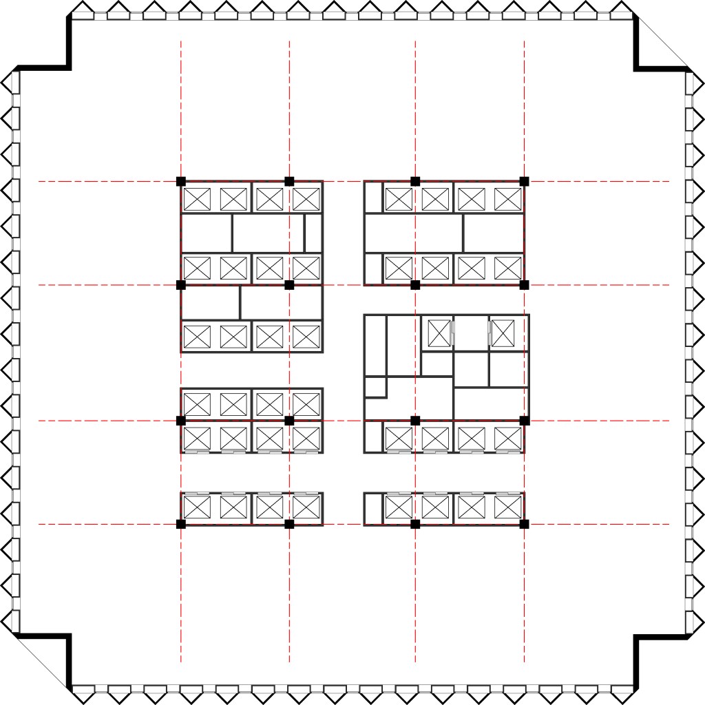 The two firms worked through 1969 to adapt Stoneโs formula to Standard Oilโs program as it grew to 3,200,000 gross square feet of corporate and tenant space. Stone proposed spreading this over 80 floor plates of 40,000 square feet each. The project benefitted from SOMโs former head of structural design, Al Picardi, who joined Perkins + Will in 1967. Picardi had overseen Khanโs tube structures and he applied that experience here. As impressive a structural system as the Hancock was, he wondered whether โit would be possible to develop a structural system with efficient tube action, yet simplify the fabrication and erection problems?โ A โnatural concept to consider,โ he concluded, would treat the exterior frame as โsteel plate walls with openings only large enough to accommodate architecturally acceptable vision panels.โ The result would distribute material evenly around the buildingโs perimeter, instead of concentrating it in discrete, heavy columns– a scheme more like the perimeter structures being designed in concrete by Dubin, Dubin, Black, and Moutoussamy or Leslie Robertsonโs tightly spaced steel columns at the World Trade Center. Picardi designed a tube of 64 broad, triangular folded plates, 10 feet on center, each wrapping a vertical shaft accommodating ducts or pipes, with 5โ-0โ windows and induction units between them. These plates were shop-welded in three-story lengths and field-bolted to 5โ-6โ deep spandrel beams, forming a planar wall of deeply corrugated steel on each of the buildingโs four sides. Within, a grid of sixteen columns formed a 95โ square core and 45โ-0โ bays, spanned with 38-inch open web steel joists large enough to accommodate ductwork services. The buildingโs corners consisted of rigid steel plates forming nine-foot-deep re-entrant angles, making the tower into a stiff-edged box.[vi] Picardi claimed nearly the same material efficiency as the Hancock but with significant fabricational savings due to its simpler geometry. Standard Oil has just one basic floor shape, multiplied over the buildingโs full height, with none of the Hancockโs sloping walls, making it โsimpler in design, less expensive to fabricate, and easier to erect than conventional or previous tube systems.โ[vii] Stone and Perkins & Will planned a simple cladding scheme for the building, replicating the white marble columns and dark spandrels and glass that had wrapped U.S. Gypsum and General Motors.[viii]