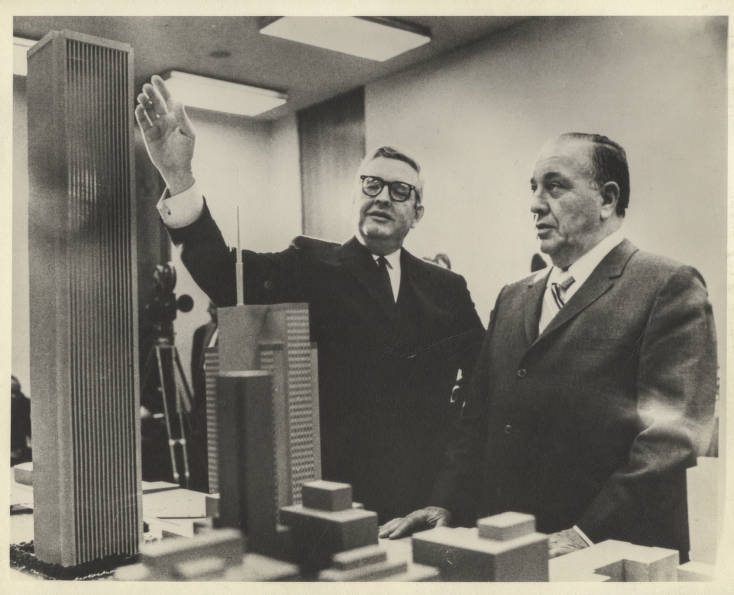 Standard Oil of Indiana began as an offshoot of John Rockefellerโs Standard Oil trust after it was broken up in 1911. From its inception, it had occupied a 13-story Marshall and Fox-designed building at 910 South Michigan, but postwar growth had forced it, like Sears, to lease offices throughout the city. Standard revealed plans in September 1968 to build over the Illinois Central rail yards east of the Prudential Building. Negotiations took place throughout 1969 to develop the railroadsโ air rights into what would become Illinois Center, but Standard proceeded independently, ignoring that projectโs zoning and size recommendations.[i] In March 1969, the company announced that it would build 2 million square feet of office space on its site, to be designed by two architectural firms: Chicago-based Perkins & Will, and New York-based Edward Durrell Stone.[ii]