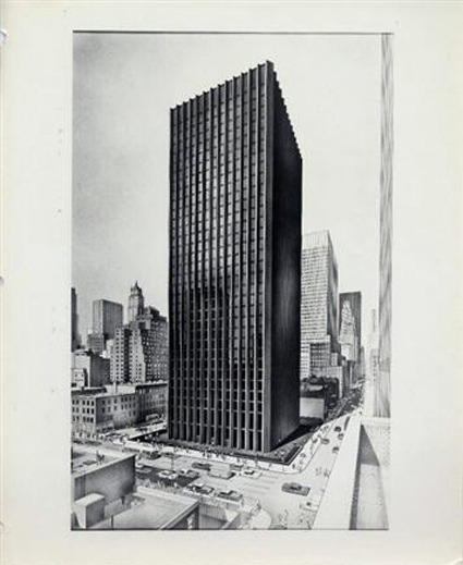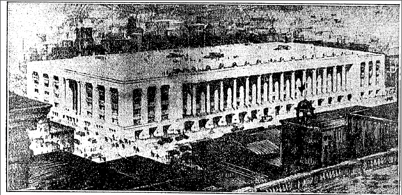 “Plans for new Chicago Postoffice provide landing field for air mail planes” the Tribune announced in July, 1927, along with a rendering–presumably by Graham, Anderson, Probst, and White, but not attributed–of a monumental, neoclassical postoffice for the blocks between Harrison, Polk, Clinton, and Canal streets–with air mail planes wandering around its flat-topped roof.