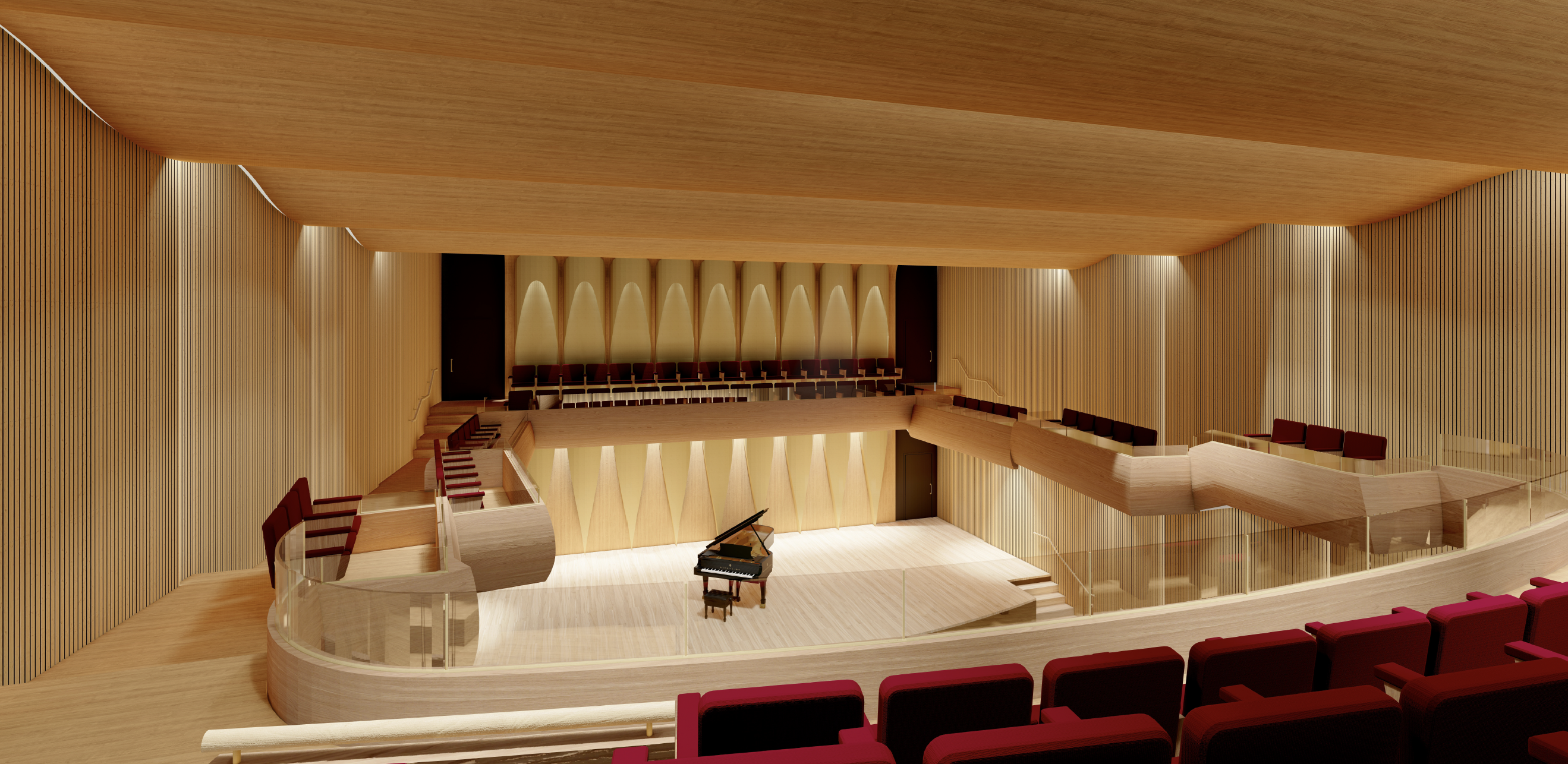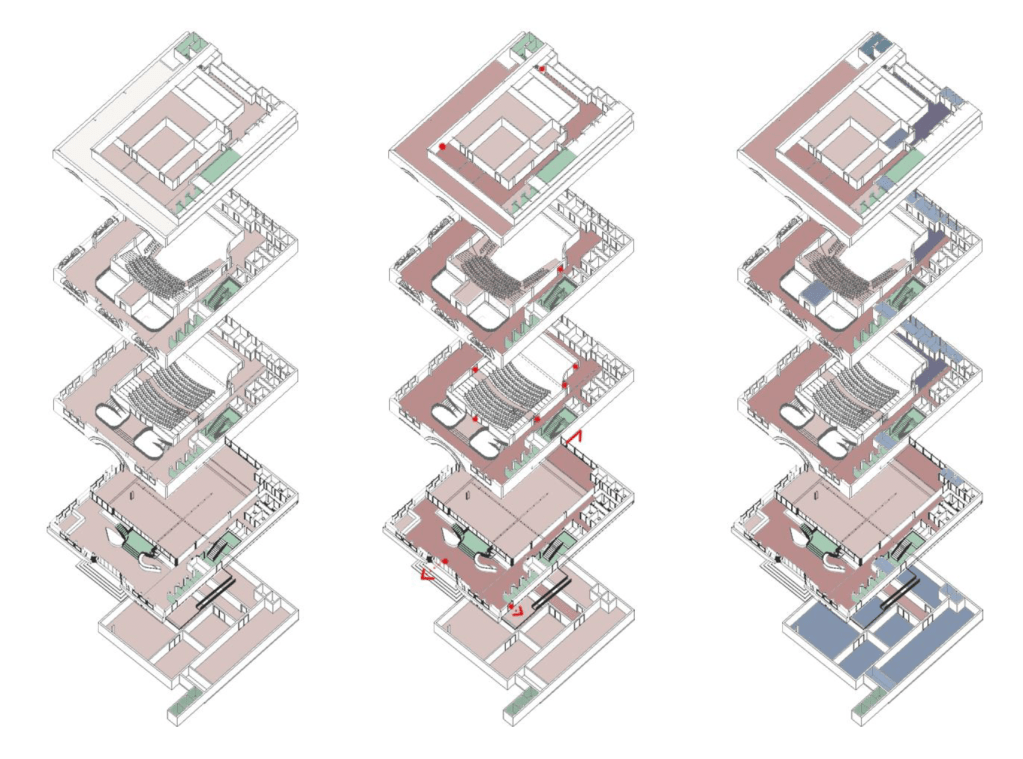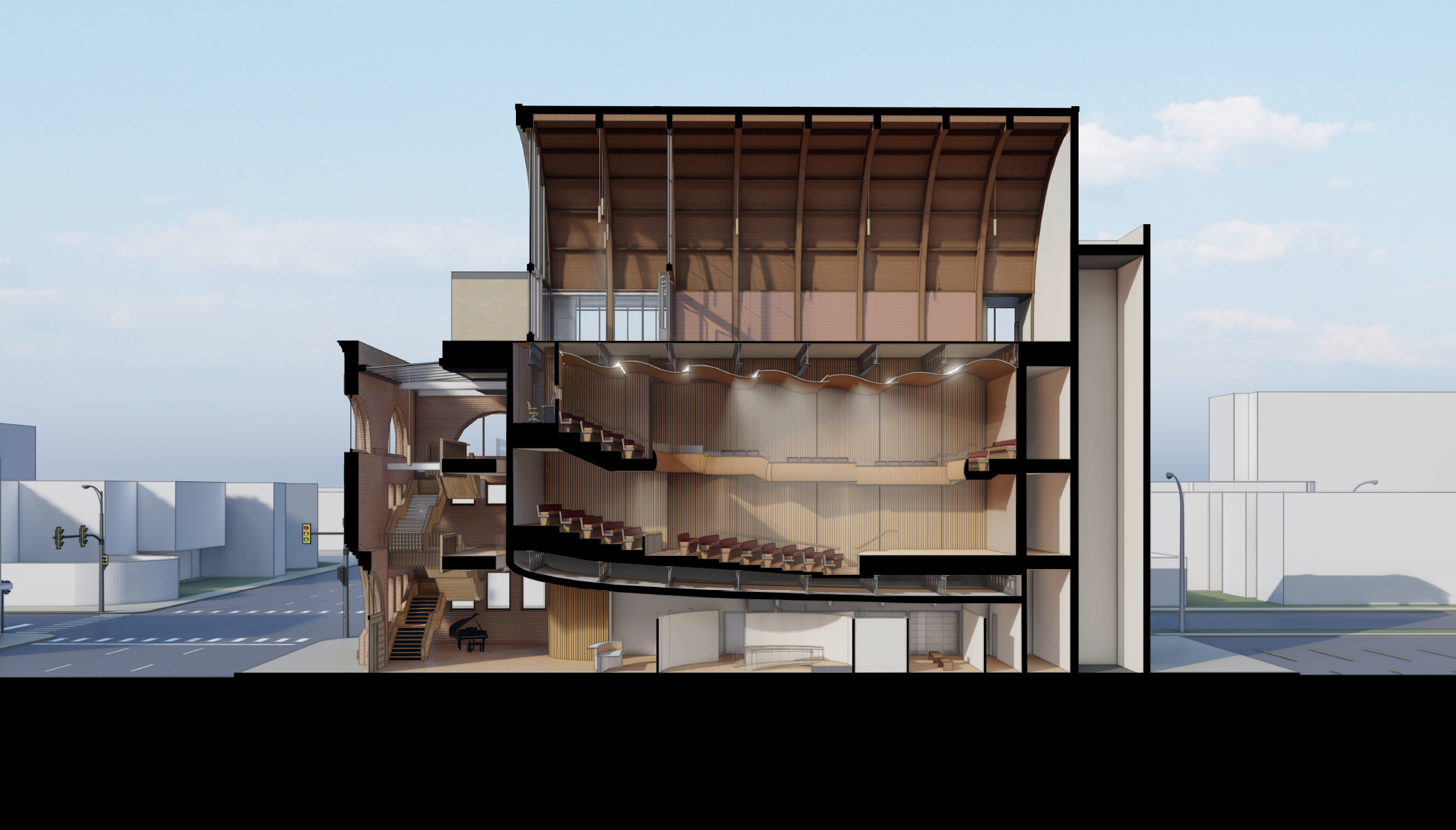 That proved to be a challenging but inspiring brief. Students tackled the problems of wedging a 450-seat auditorium, along with exhibition spaces, offices, public facilities, and extensive back-of-house requirements into the confined footprint of the original Church—while paying homage to the relics of the Sullivan walls. Gospel, we learned from UIUC music postdoc Alonza Lawrence, has both a deep tradition and an energetic range of current practitioners. How to build for a genre that incorporates influences from classical to hip-hop layered additional questions onto the spatial and civic charges the site and program already offered.