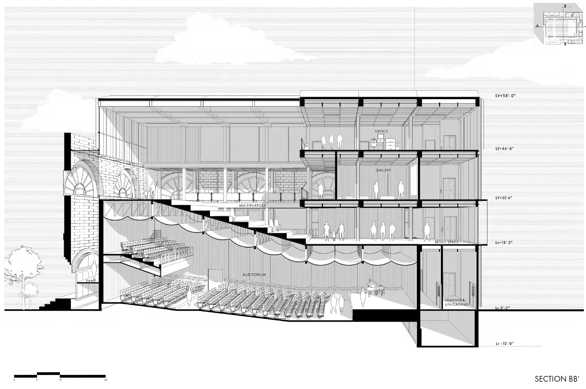 We took an admittedly liberal view of preservation standards, trying to see the Sullivan elements more as catalysts than museum pieces. But each project found inspiration from the existing compositions—either in massing, detail, materiality, or proportion. Some were inspired by seeing the raw, scarred interiors of the walls, composed of seven layers of structural brick and bearing the marks of the collapsed iron structure within. Those surfaces seemed to tell a more complete history of the original structure and the fire. Others saw opportunities to look forward, with glass skins, metal screens, or timber vaults that extended new interior volumes above or next to the originals, again trying to find a dialogue between the structure’s past, present, and future lives.